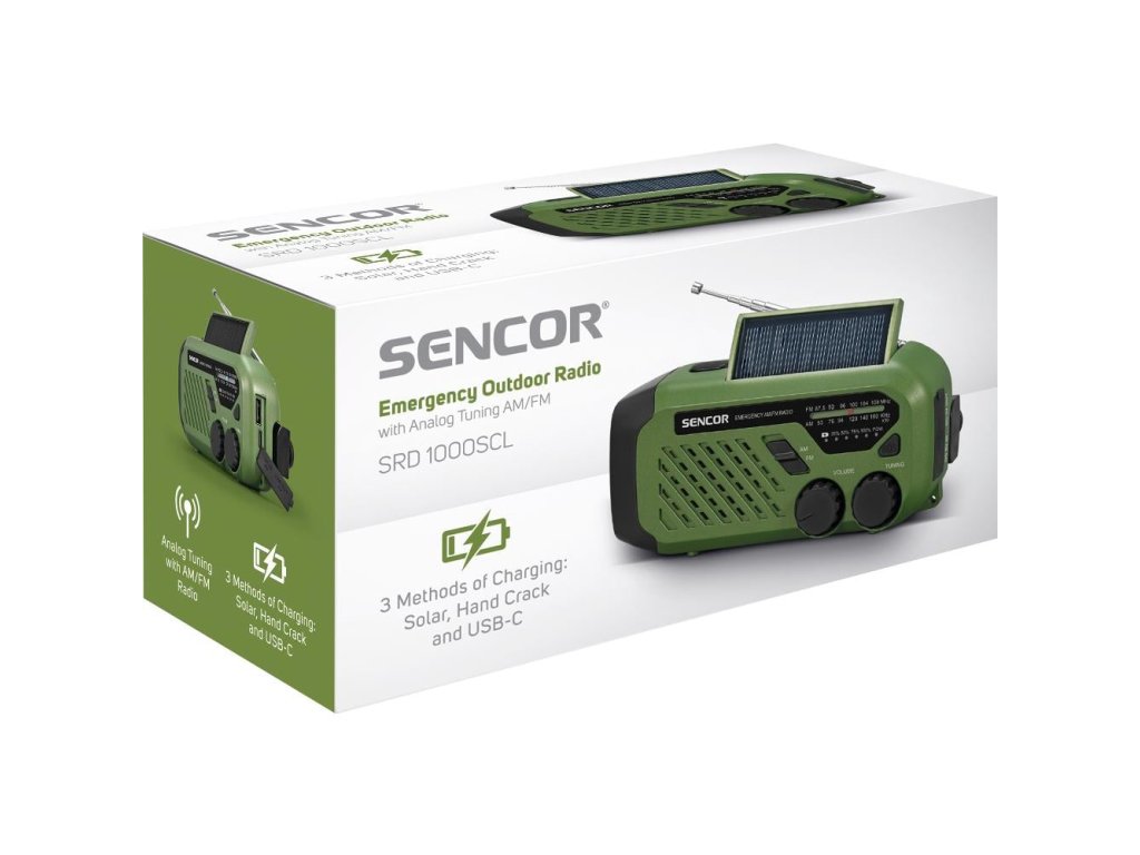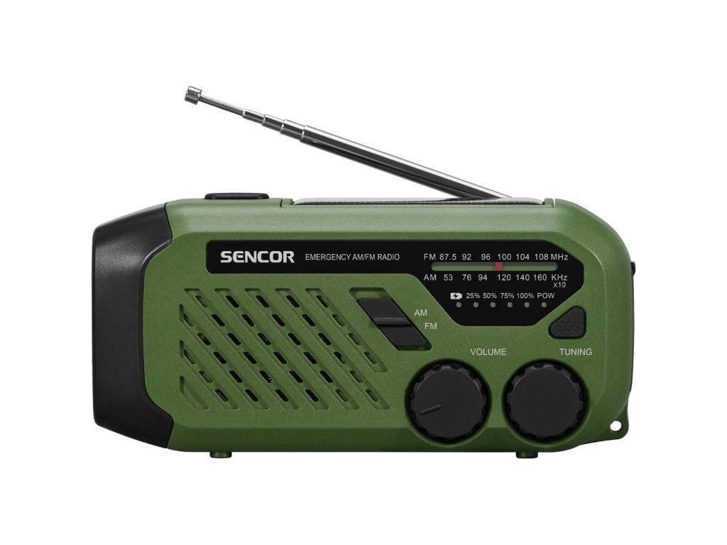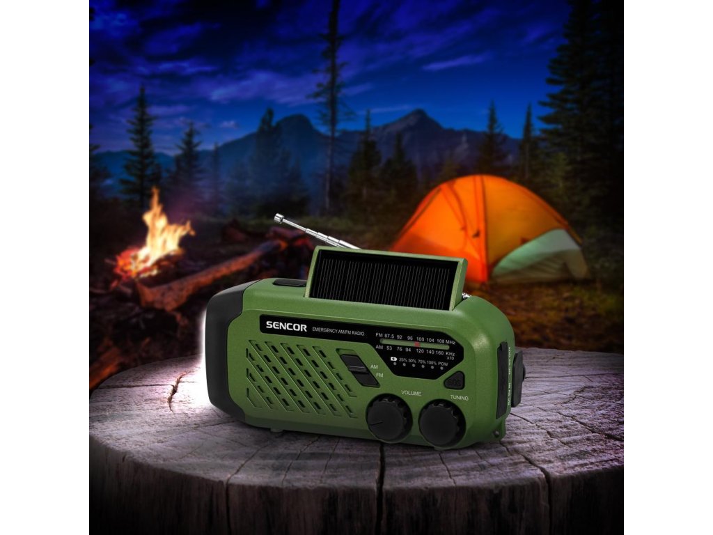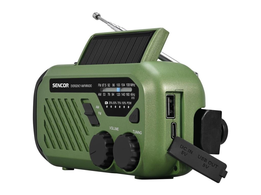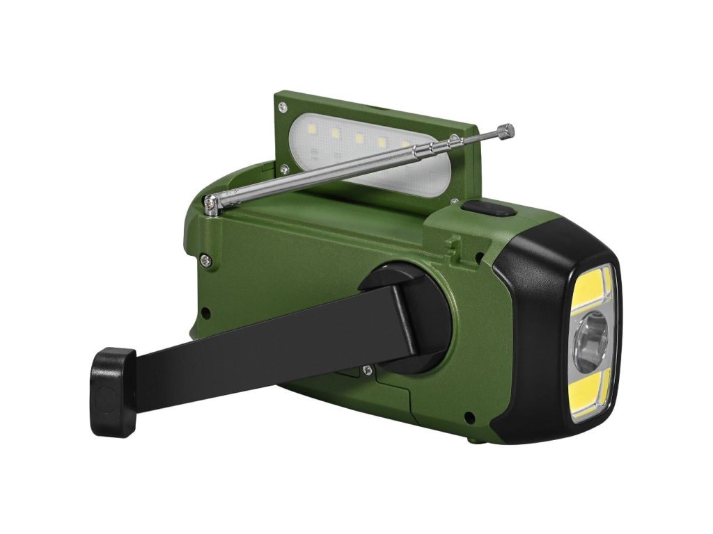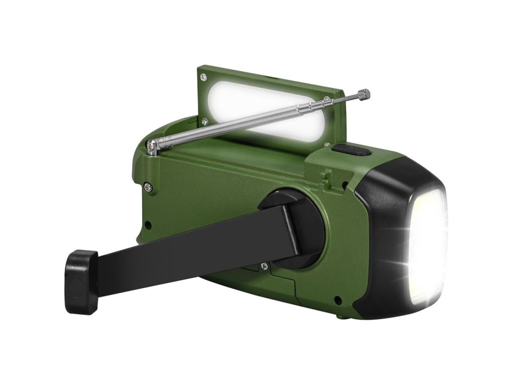 rádio - klasické • přenosné • FM tuner • výkon 1 W • SOS tlačítko a svítilna součástí • na kliku/Na dynamo • síťové a solární napájení • na integrované baterie • stupeň krytí IPX3 • rozměry 70 × 145 × 53 mm (V׊×H) • hmotnost 0,25 kg