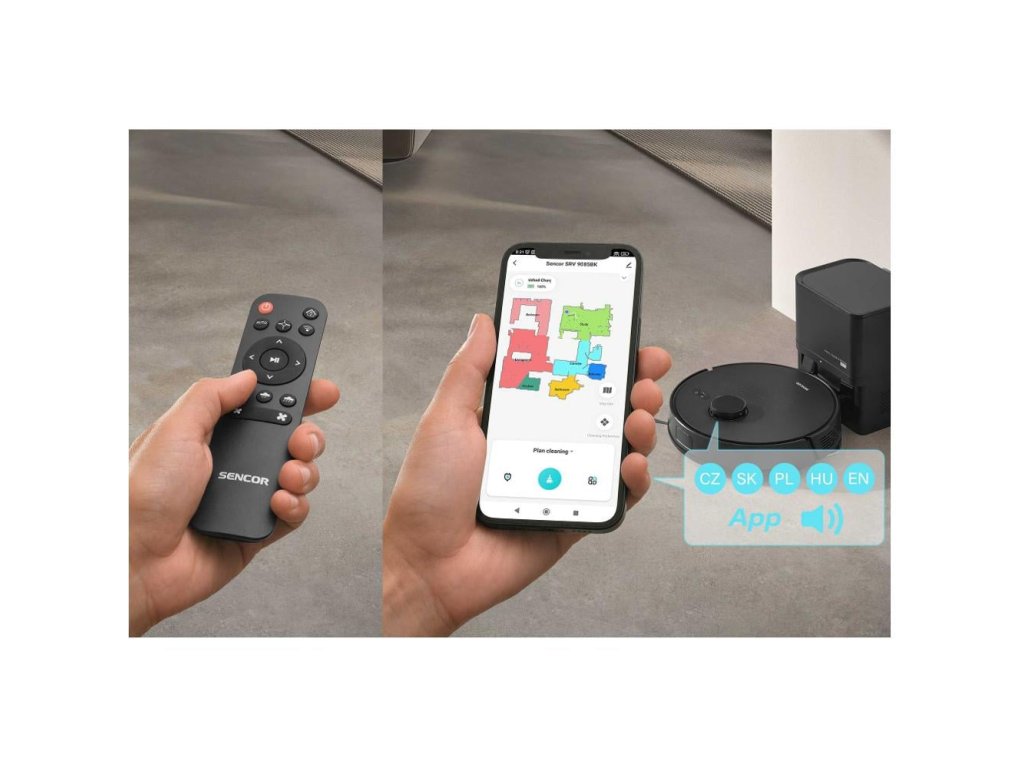 robotický vysavač s dokovací stanicí • laserová navigace Lidar • Li-Ion baterie s kapacitou 2 600 mAh, výdrž až 130 minut • mobilní aplikace Sencor Home • výška: 9,7 cm