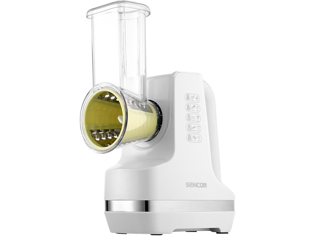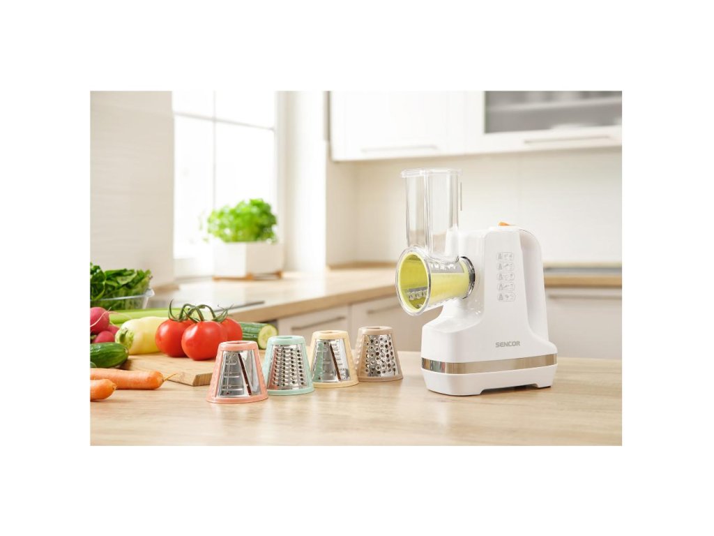 elektrické struhadlo • možnost strouhat a krájet do misky nebo přímo na talíř • snadné čištění díky uzavřené konstrukci • 5 kusů vyměnitelného příslušenství • tichý provoz