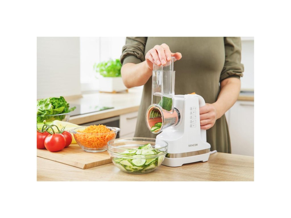 Ušetřete čas v kuchyni s univerzálním kráječem SSG 4300WH. Tento moderní asistent se skvěle hodí na kuchyňskou linku, kde bude pevně stát díky protiskluzovým nohám. Tvar krájení a strouhání můžete zvolit nasazením jednoho z 5 přiložených nástavců. Stačí stisknout tlačítko pro spuštění motoru a můžete si připravit barevné pohoštění, polévky, saláty a jiné skvělé recepty.