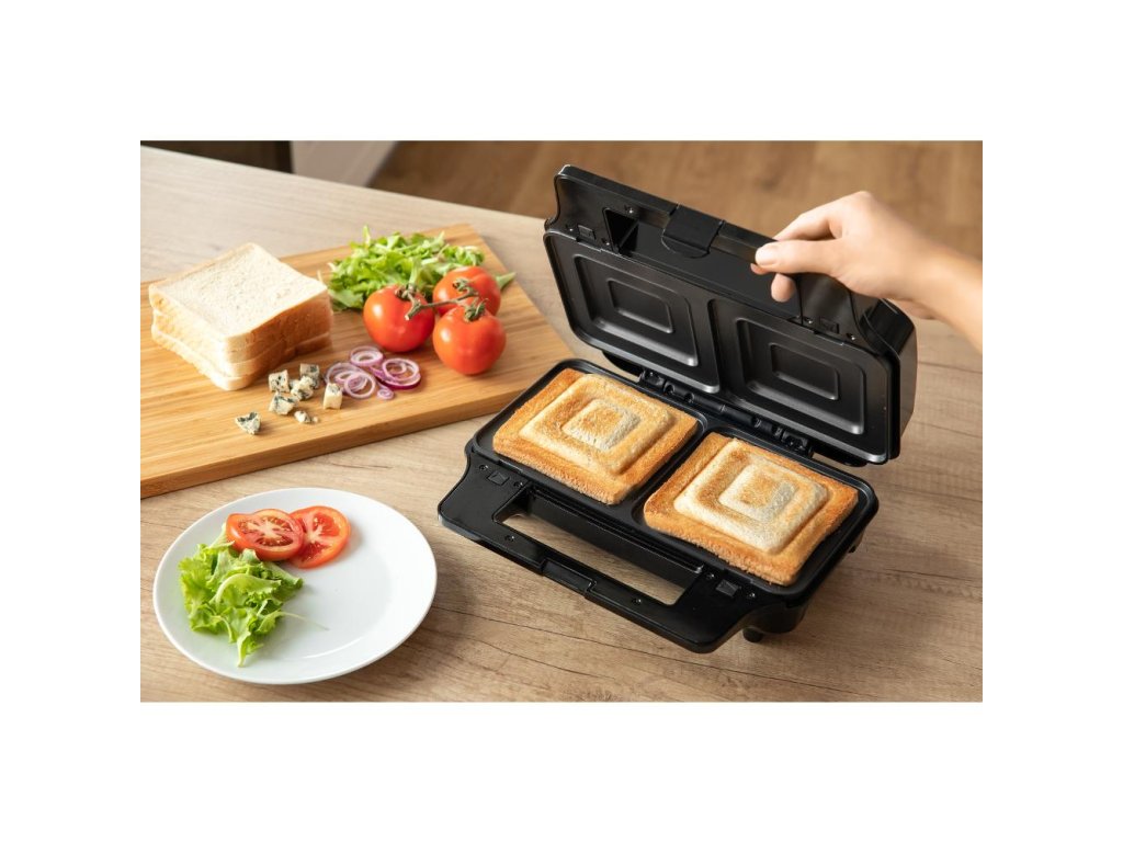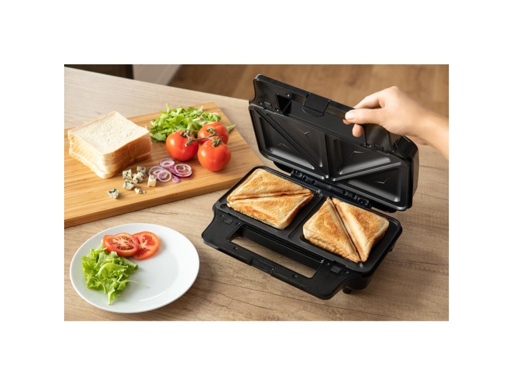 Chystáte se na výlet nebo jen potřebujete přichystat rychlou večeři nebo svačinu do zaměstnání a ratolestem do školy? Sáhněte po pečicí desce pro přípravu trojúhelníkových toastů. Můžete vsadit na ověřenou klasiku a naplnit je plátky sýra a šunky. Existuje však nespočet variací, které lze obměňovat dle chuti. Zaexperimentujte s přidáním koření (sladká paprika), zeleniny (rajčata) nebo se zaměřte na speciální sýry a různé druhy chleba.