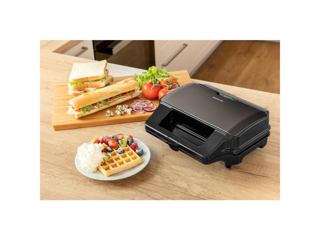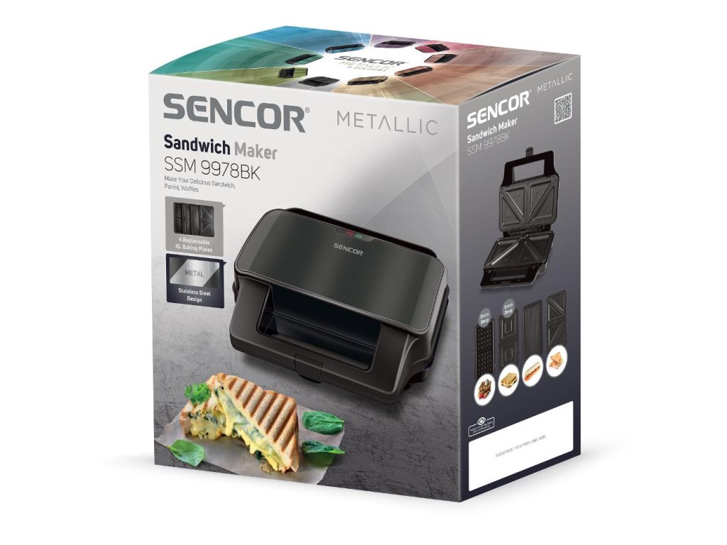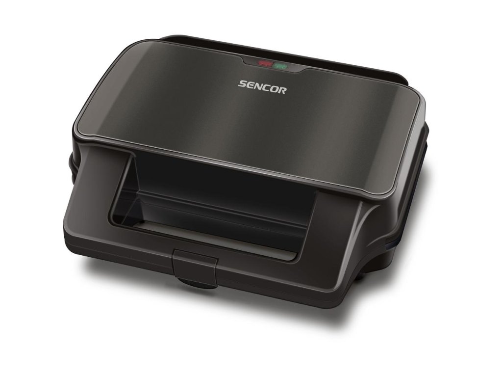 Rádi si v pohodlí domova dopřáváte toasty, panini, bagety a vafle? Pak vsaďte na Sencor sendvičovač s výměnnými deskami. Připraveny jsou pro vás rovnou čtyři vyměnitelné pečicí plochy pro jednotlivé druhy pečiva, dokonce i typický americký sendvič větší velikosti. Jistě vás oslní zajímavý metalický design. Zlatou barvu dobře zkombinujete s jakýmkoliv vzhledem kuchyňské linky. Výhodou sendvičovače je, že jsou jeho desky nepřilnavé, a tak se velmi snadno čistí.