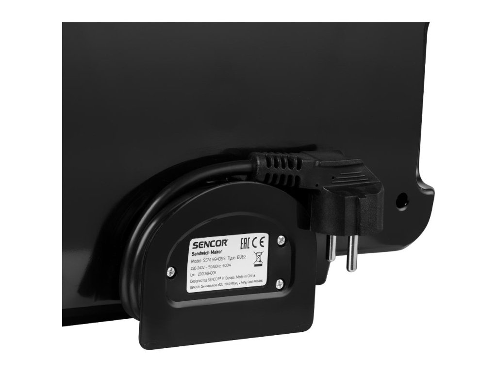 Všechny desky se mění rychle a pohodlně. Hladký proces zajišťuje zámek a postranní závěsy. Pro bezpečnou manipulaci a přenos je připravena tepelně izolovaná rukojeť. Sendvičovač také jednoduše složíte do svislé polohy tak, aby vám nikde nepřekážel. K uložení kabelu je připraveno závěsné očko, díky kterému nedojde k zamotání kabelu.