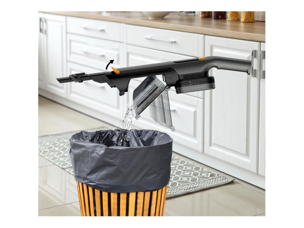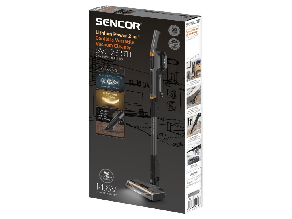 akumulátorový tyčový vysavač 2v1 • digitální 150W motor • vysoce účinná vyměnitelná Li-Ion baterie 14,8 V s kapacitou 2 200 mAh • doba provozu až 30 minut • hlučnost 86dB • 3 stupně výkonu • systém HEPA