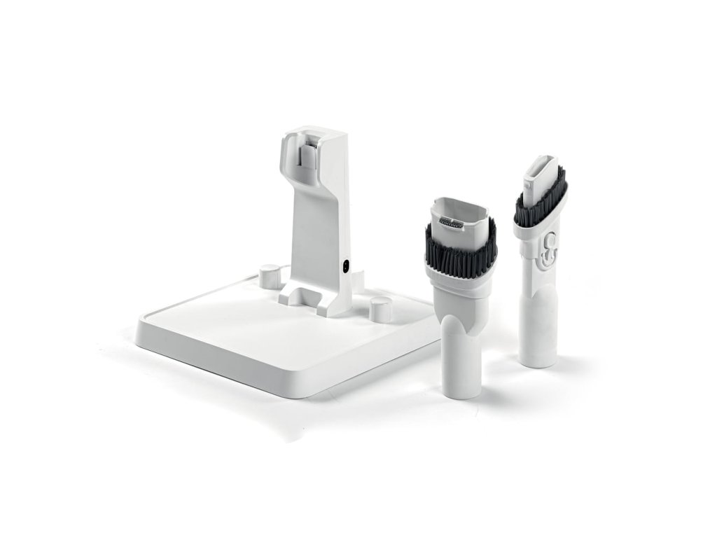 Součástí balení je samostojící nabíjecí stanice s integrovanou funkcí nabíjení a držáky na příslušenství. Po skončení úklidu stačí vysavač odložit do stanice, kde se začne automaticky nabíjet. Je tak vždy připraven pro další úklid.