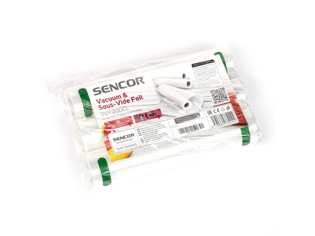 Vakuovací folie na potraviny Sencor SVX 200CL je kompatibilní se všemi vakuovacími svářečkami folií od značky Sencor. Tato varianta má délku 3 000 mm a šířku 200 mm, která je ideální na vakuování ořechů, zeleniny a uzenin.