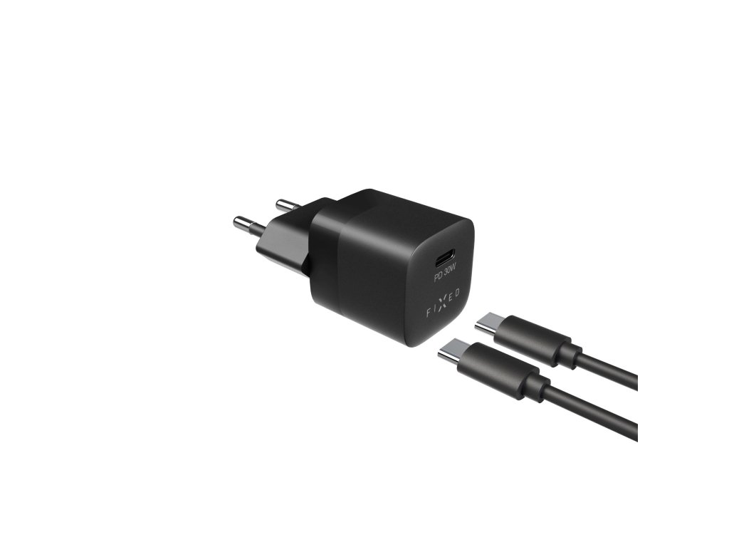 Set síťové nabíječky FIXED Mini s USB-C výstupem a USB-C/USB-C kabelu, podpora PD, 1 metr, 30W, černý