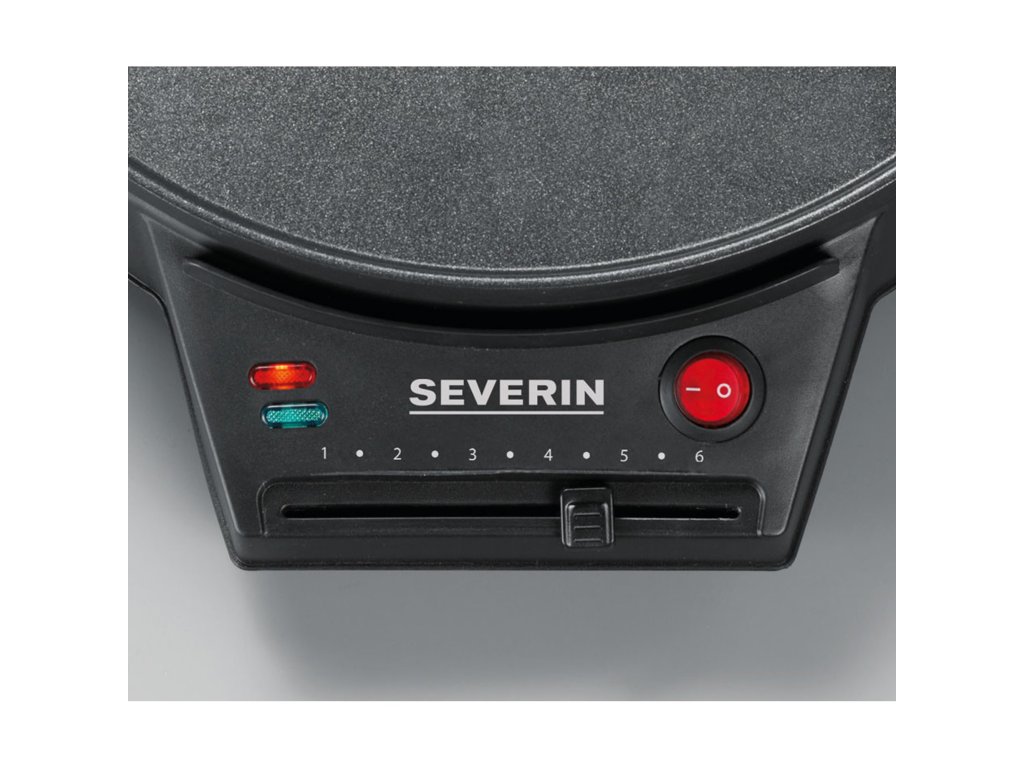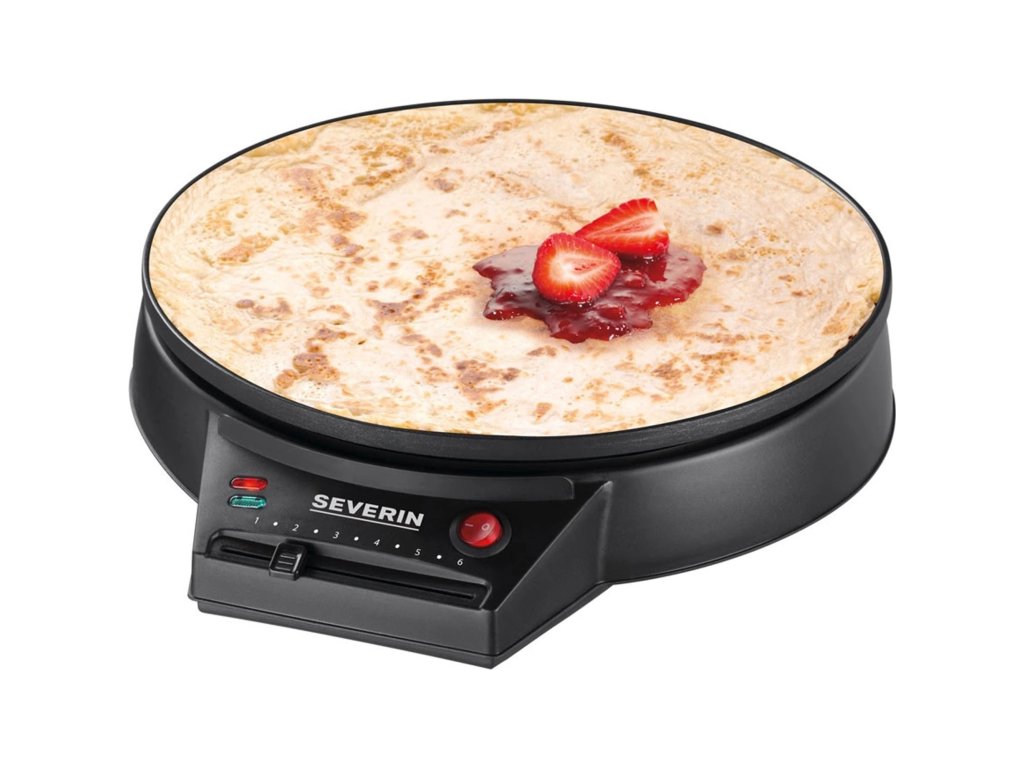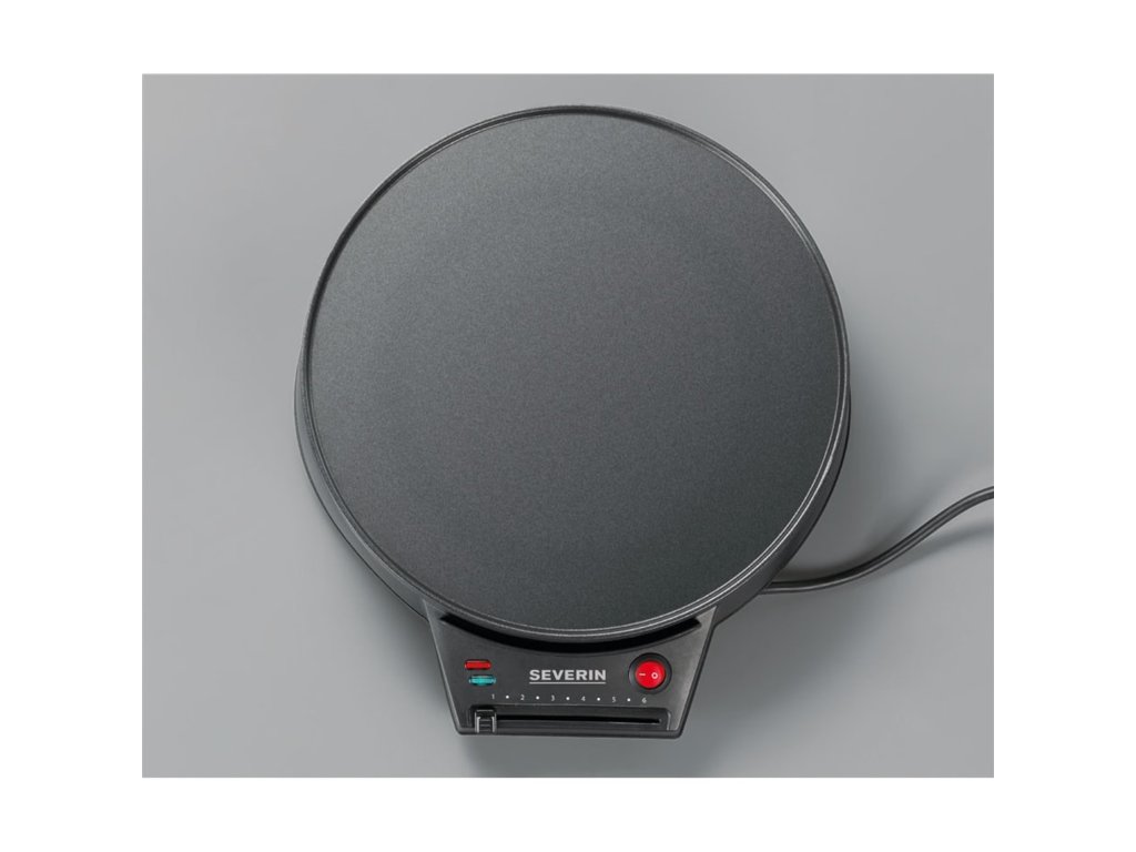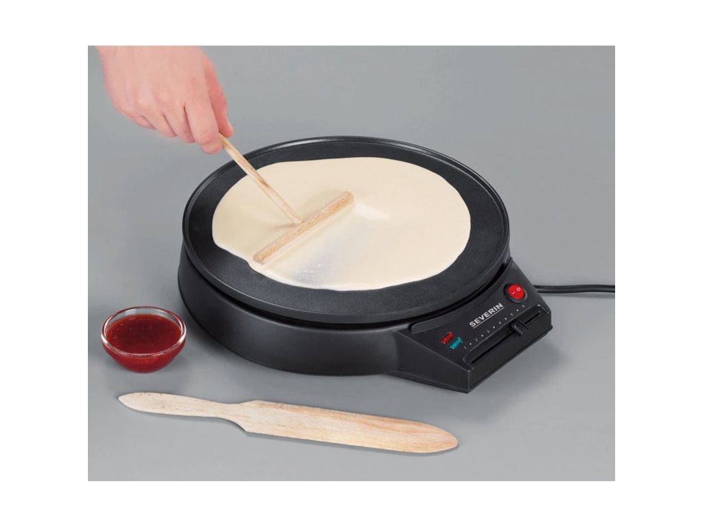 1000W, plastový plášť, nepřilnavý povrch, průměr cca 30 cm, nastavení teploty, spínač pro zapnutí/vypnutí, kontrolka provozu, signalizace spotřebič připraven k provozu, dřevěná lopatka na těsto + obracečka, navíjení kabelu, protiskluzové nožičky, černý