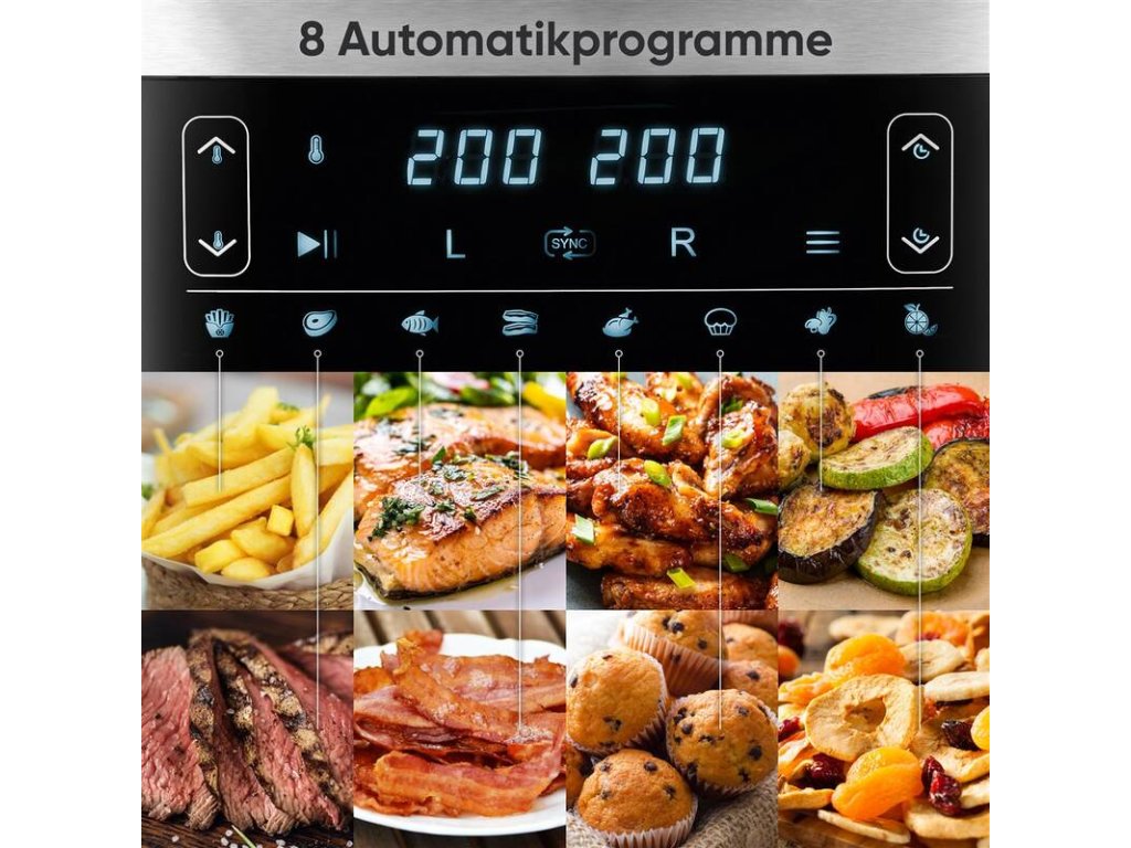 Horkovzdušná fritéza, duální, příkon 2 850 W, nastavitelná teploty, nepřilnavý povrch, časovač.