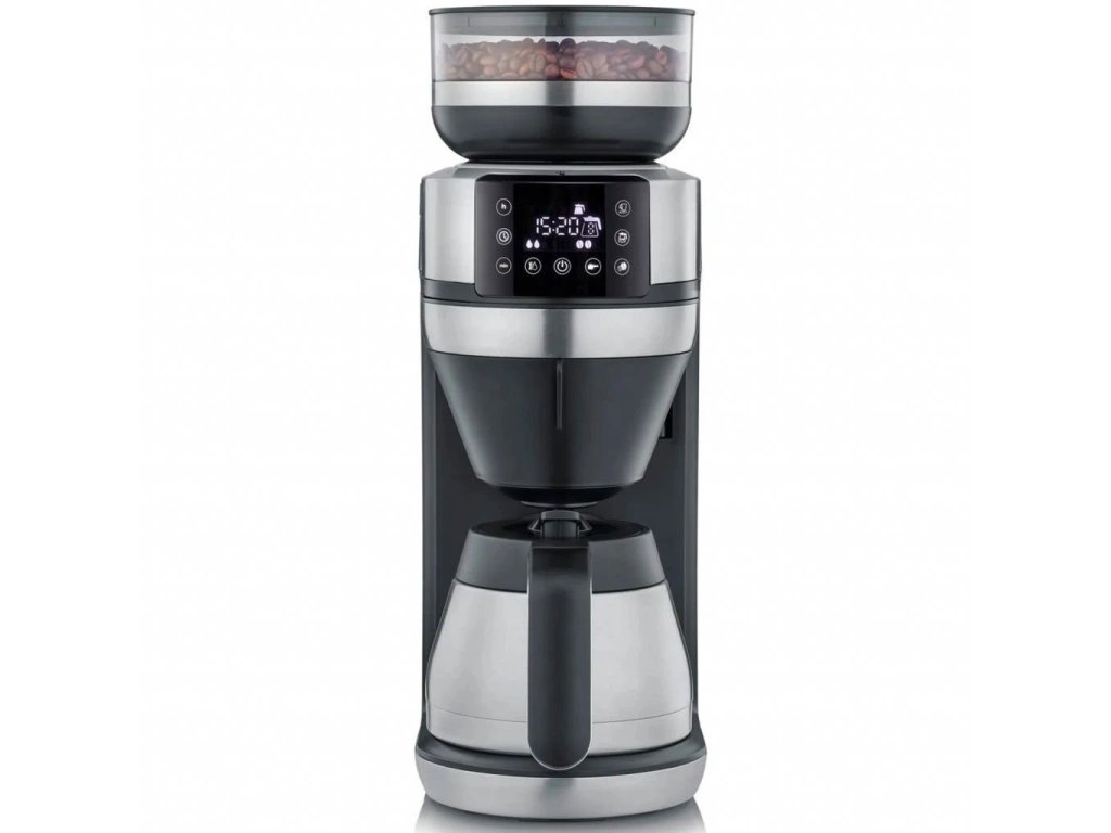 Kávovar s mlýnkem, překapávací, příkon 1520 W, objem konvice 2 l, časovač, na maximálně 10 šálků, ukazatel množství vody, termokonvice, optimální teplota spařování 96°