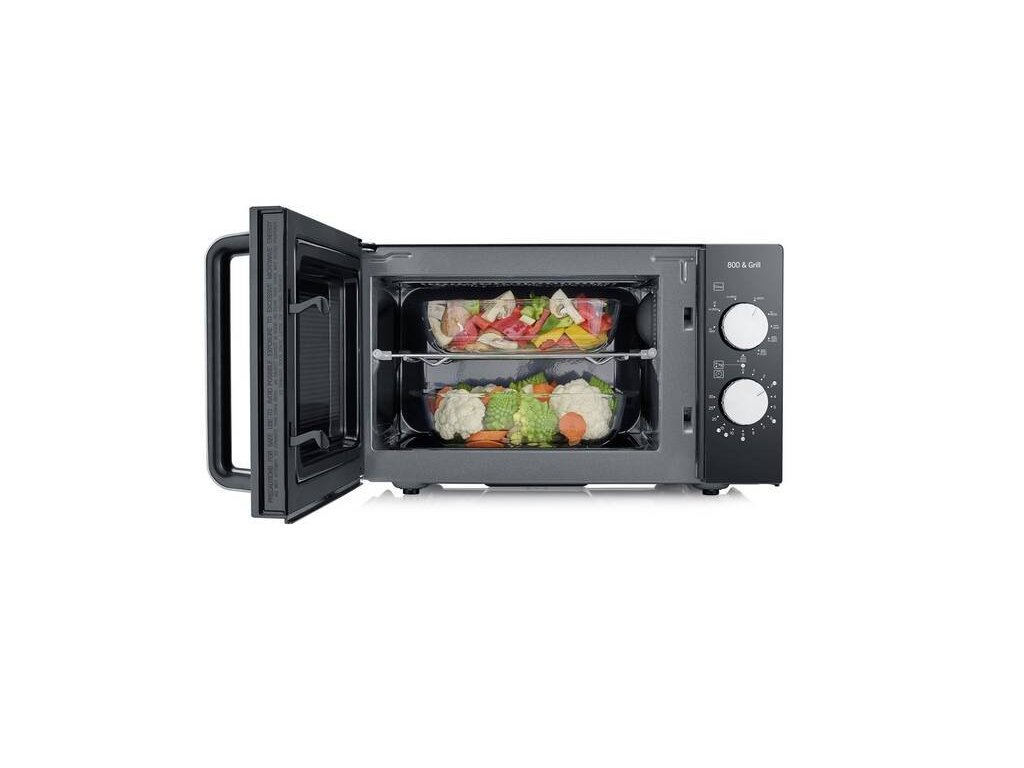 mikrovlnná trouba 2 v 1 • mechanické ovládání • výkon 800 W • objem 20 l • gril • bez otočného talíře • 9 úrovní výkonu • funkce rozmrazování • zasouvací rošt pro vaření ve 2 úrovních • keramické dno • V × Š × H: 27 × 46,2 × 39,5 cm • černá/nerez