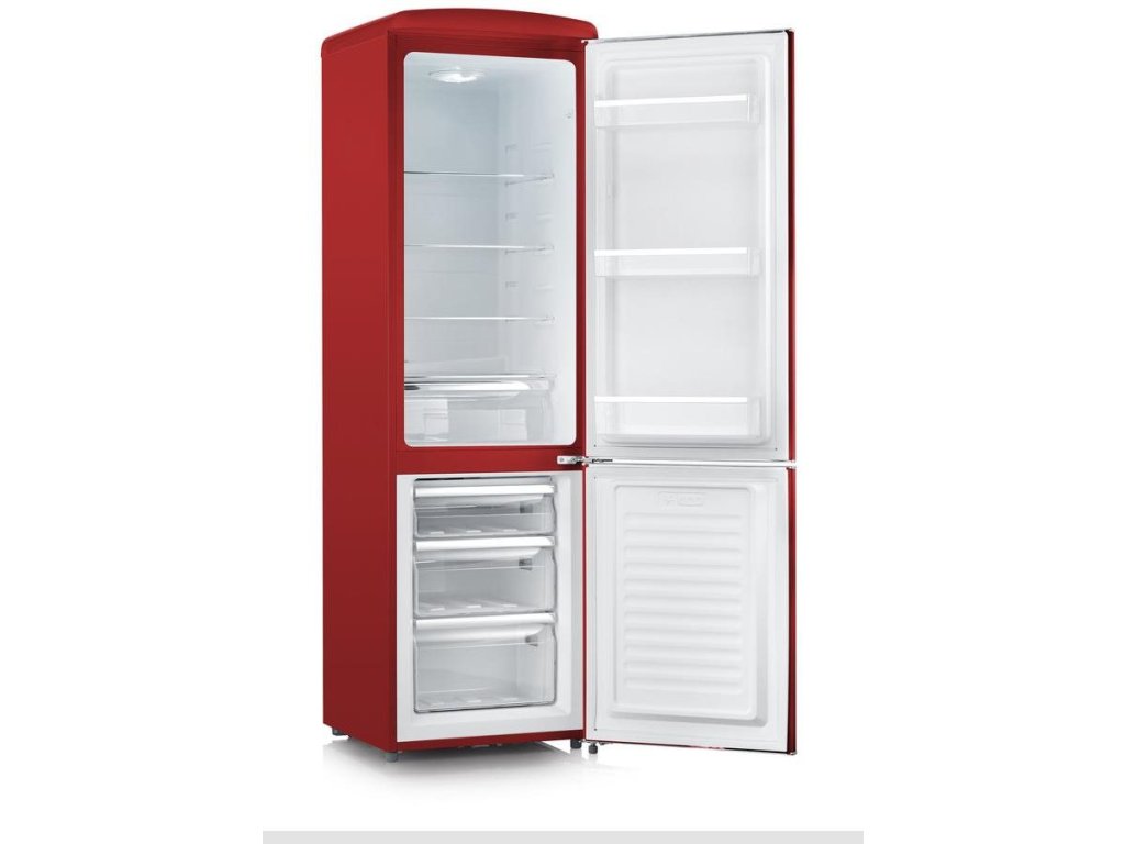 Kombinovaná retro chladnička, volně stojící, energetická třída D, hlučnost 39 dB, objem 244 l (181/63 l), LED osvětlení, rozměry: 660 x 580 x 1895 mm, červená