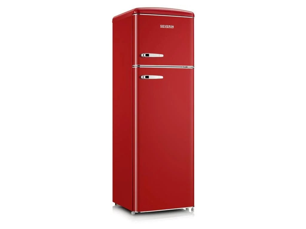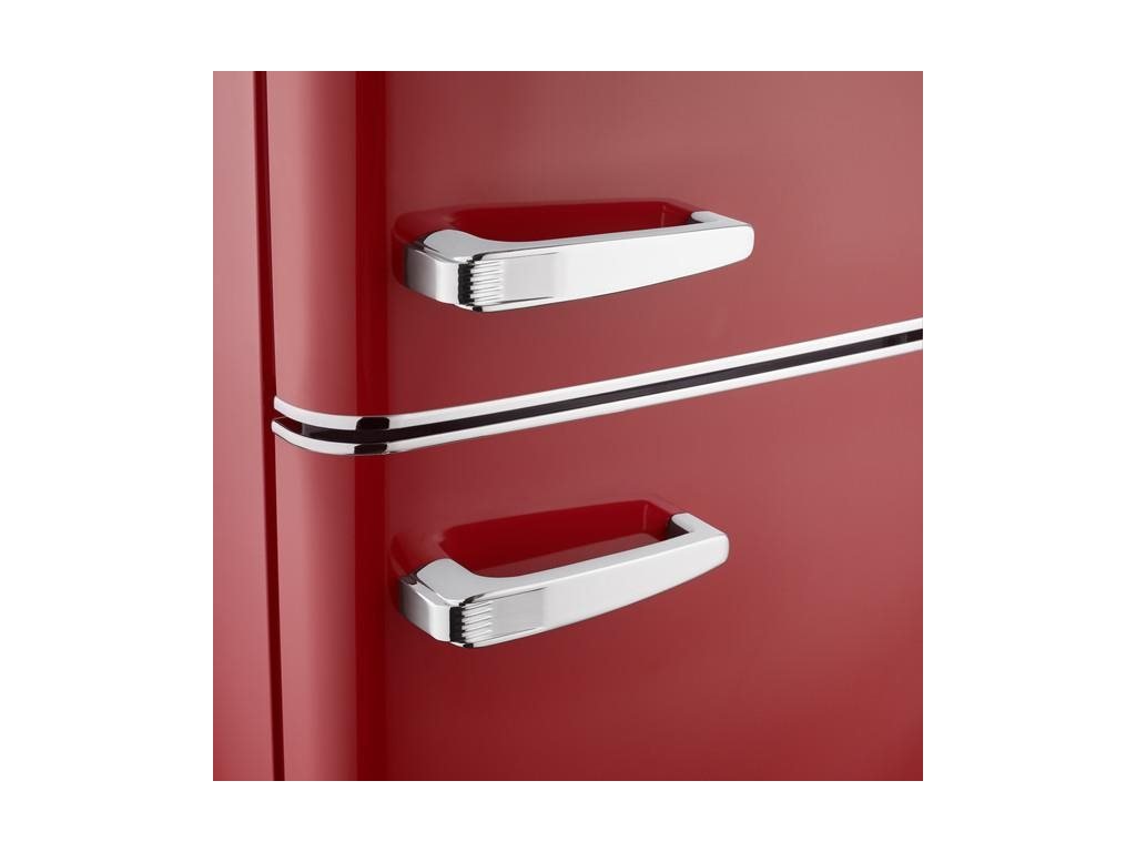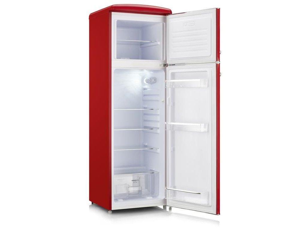 Kombinovaná retro chladnička, volně stojící, energetická třída D, hlučnost 39 dB, objem 246 l (194/52 l), LED osvětlení, červená