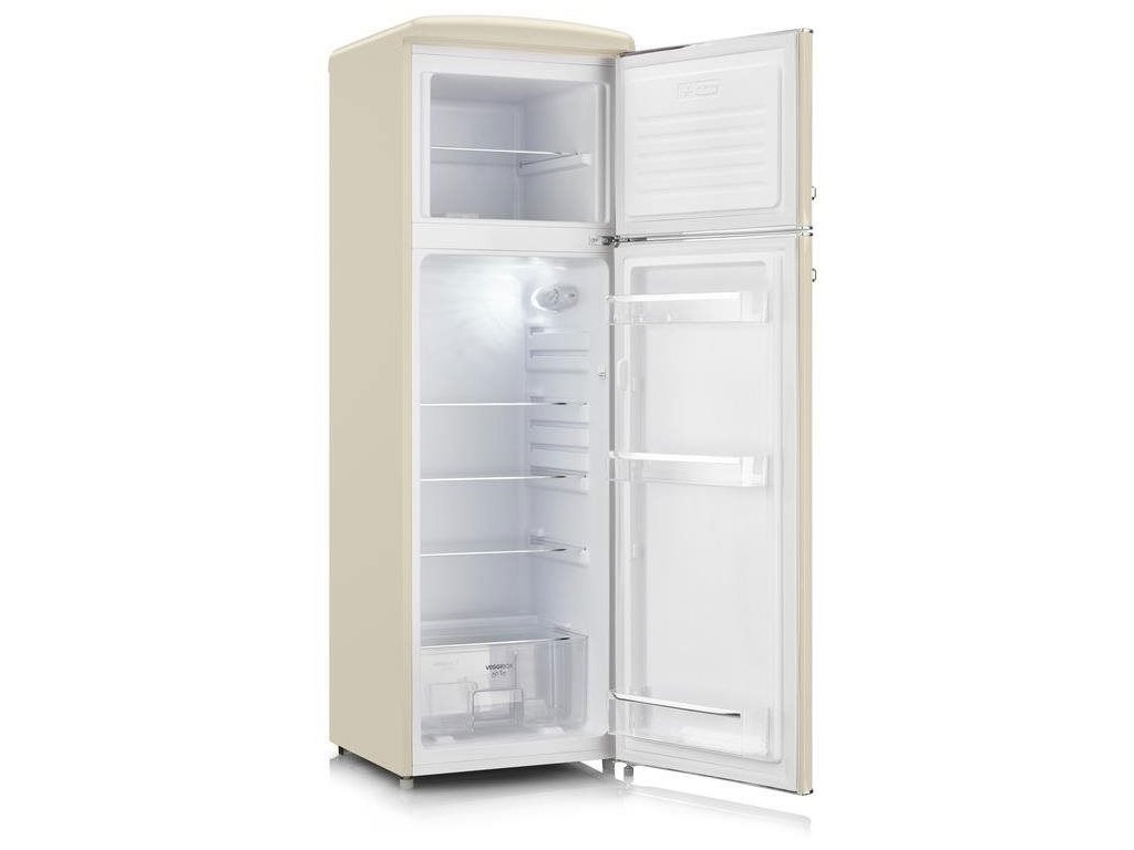 Kombinovaná retro chladnička, volně stojící, energetická třída D, hlučnost 39 dB, objem 246 l (194/52 l), LED osvětlení, krémová