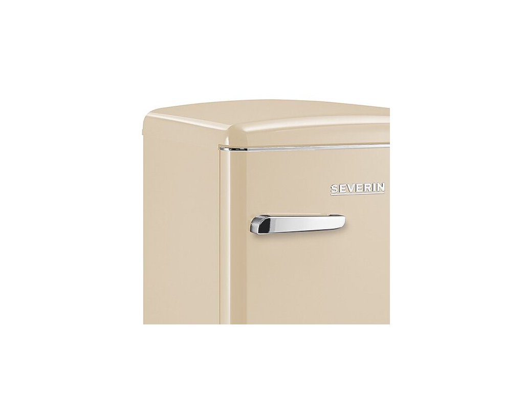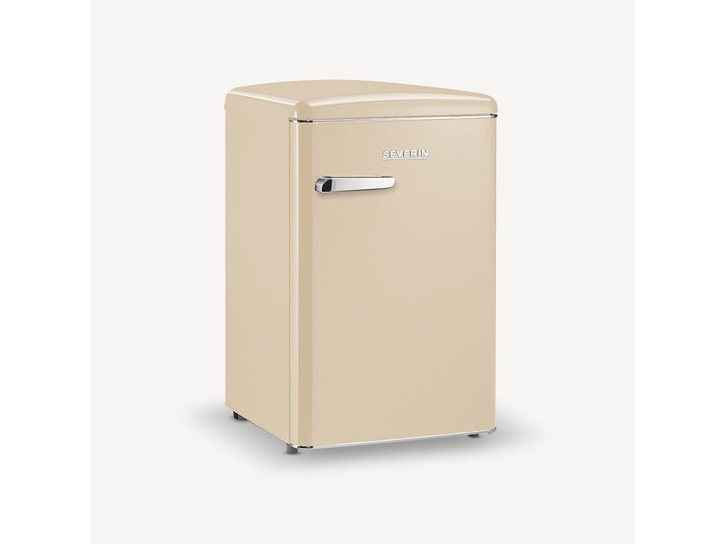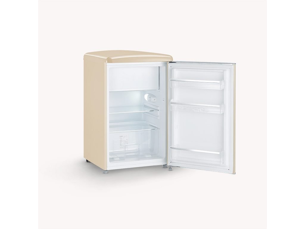 Retro chladnička, volně stojící, energetická třída D, hlučnost 41 dB, objem 106 l, mrazák 13 l, LED osvětlení, krémová