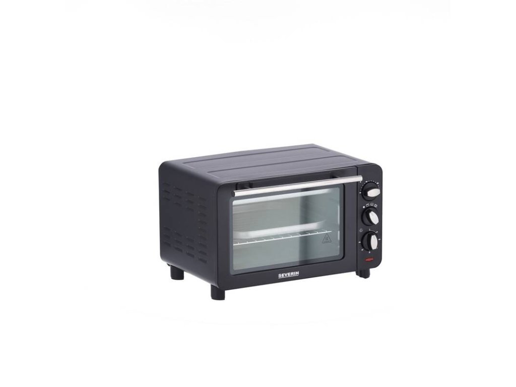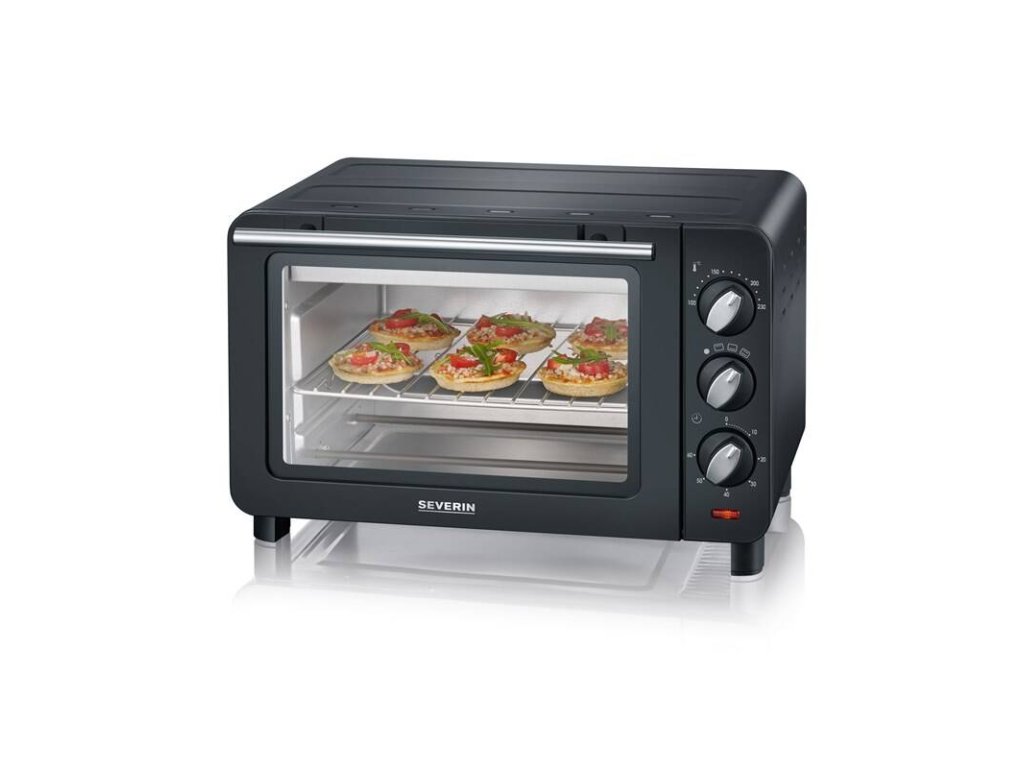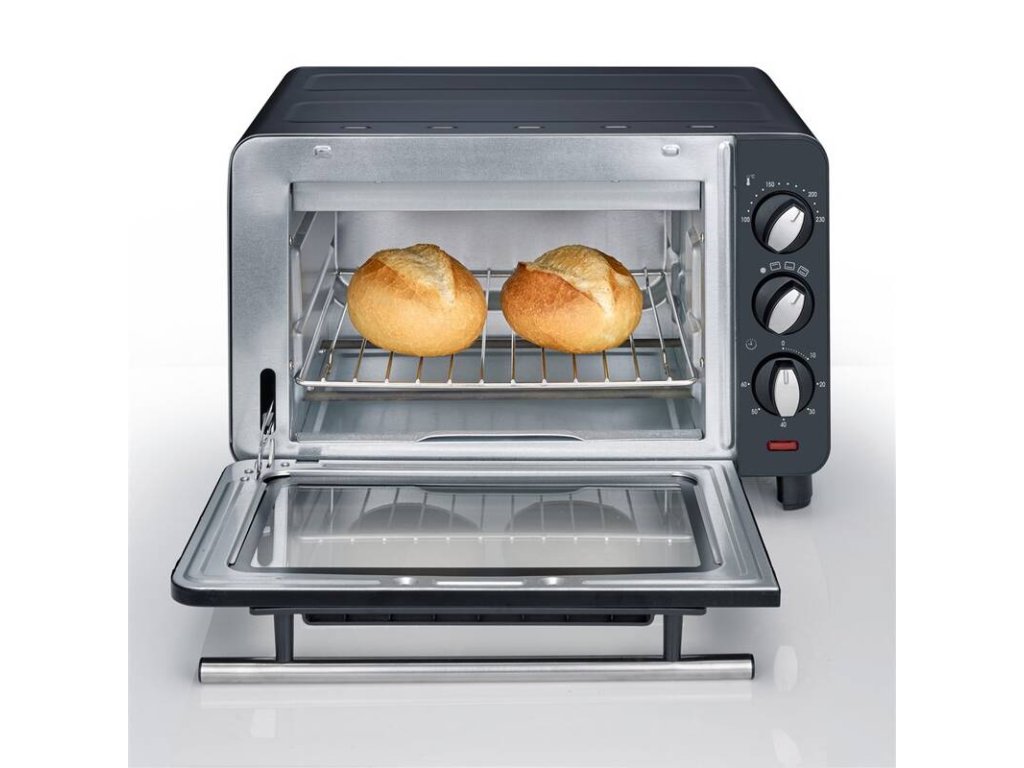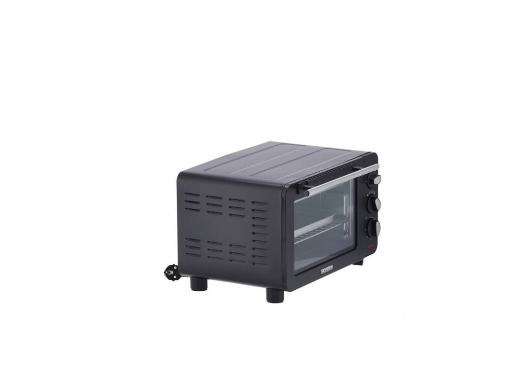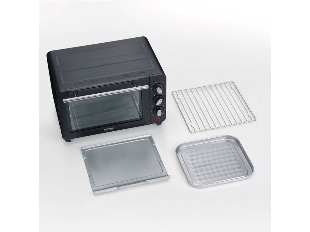 Minitrouba - výkon 1200 W, kapacita 14 l, černá barva, rozměry 25,5 × 34 × 40 cm, časovač, kontrolka, grilovací rošt 27 x 26 cm, pečící plech 24,5 x 22,2 cm, tácek na drobky, praktické držadlo