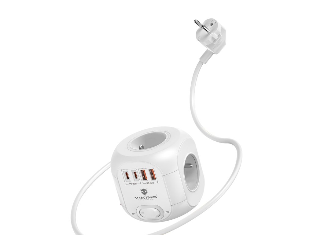 Viking AC CUBE PD30 kombinuje čtyři USB porty (2× USB-C, 2× USB-A), čtyři síťové zásuvky a 1,8m prodlužovací kabel v jednom elegantním a prostorově úsporném zařízení. Umožňuje současně napájet až osm spotřebičů nebo elektroniky, aniž by zbytečně zabíral místo na pracovním stole.