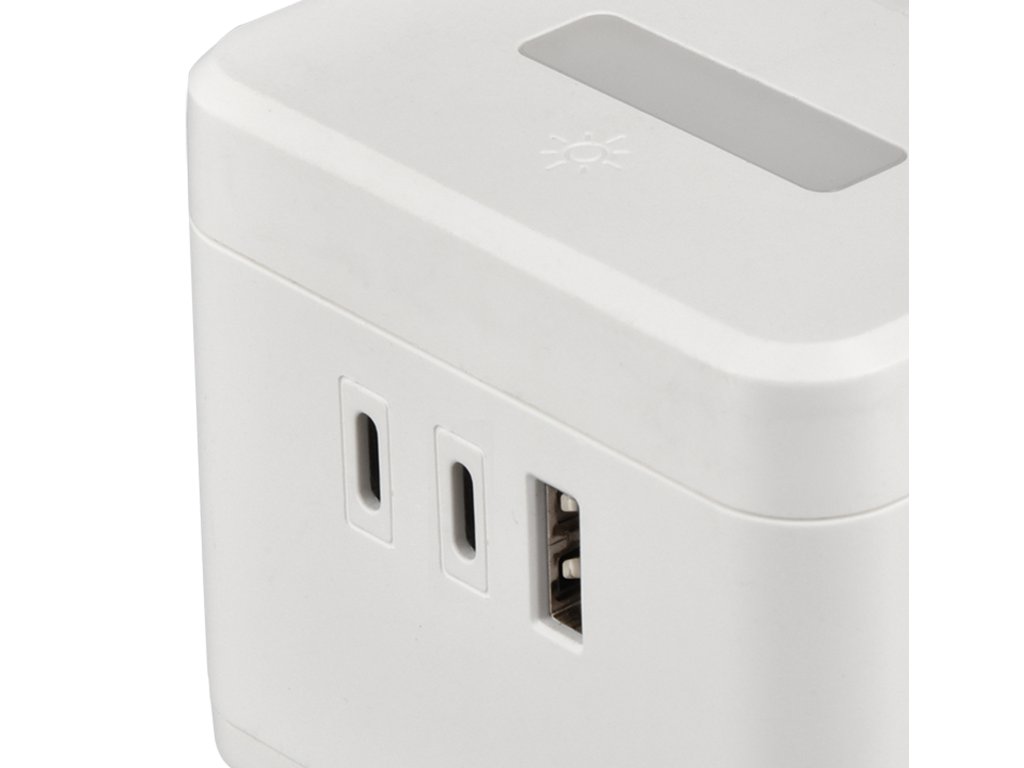 Síťový adaptér; zásuvka; rozbočovač; držák mobilního telefonu; 2 x AC (230V) výstup; 1 x USB-A (5V/3A, 9V/2A, 12V/1,5A); 2 x USB-C (5V/3A, 9V/2,22A, 12V/1,67A); dotykové světlo se třemi intenzitami svícení; kompaktní rozměry a design; kabel 1,4 m