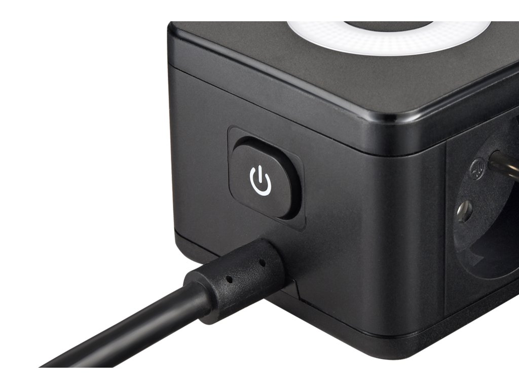 Síťový adaptér; zásuvka; rozbočovač; 2 x AC (230V) výstup; 1 x USB-A (5V/3A); 2 x USB-C (5V/3A); dotykové světlo se třemi intenzitami svícení; kompaktní rozměry a design; kabel 1,4 m; možnost nabíjení až 5 zařízení současně