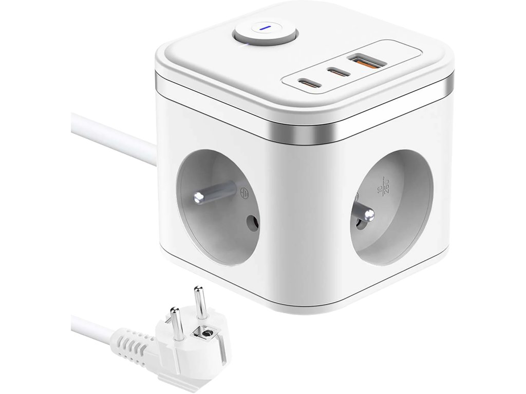 Síťový adaptér; zásuvka; rozbočovač; 3 x AC (230V) výstup; 1 x USB-A (5V/3A); 2 x USB-C (5V/3A); praktické tlačítko ON/OFF; kompaktní rozměry a design; kabel 1,4 m; možnost nabíjení až 6 zařízení současně