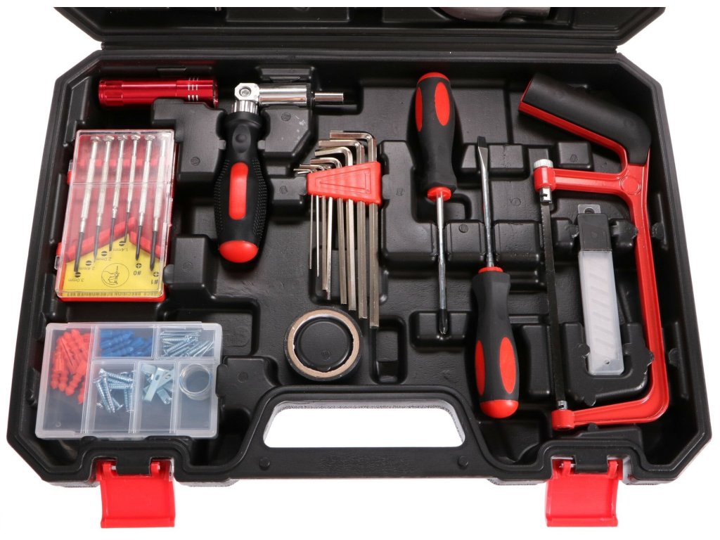 Všestranná sada nářadí SIXTOL HOME se 110 ks obsahuje vše, co můžete při práci doma nebo v dílně potřebovat. Tuto kompaktní sadu nářadí využije každý domácí kutil. V sadě naleznete základní elektrikářské nářadí, ráčnu, svítilnu, kleště, kladivo, metr, vodováhu, širokou škálu bitů a hlavic a mnoho dalšího. Součástí je i množství užitečného spojovacího materiálu. Nářadí je uloženo ve stylovém plastovém kufru, který si můžete vzít i na cesty.