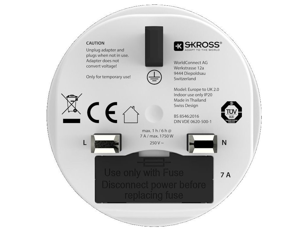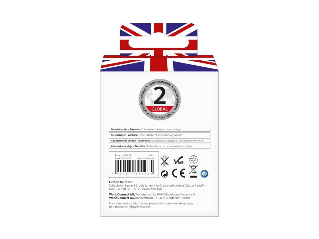 Adaptér SKROSS Europe to UK umožňuje bezpečné použití evropských zařízení v zásuvkách Spojeného království a zemích s UK standardem. Připojí uzemněné i neuzemněné vidlice přívodních kabelů, bez problémů zapojíte vše od notebooků, telefonů až po fény.