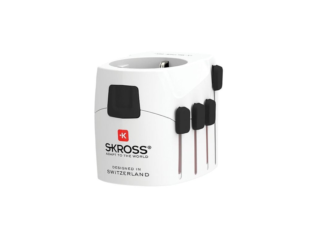 Nejvýkonnější uzemněný adaptér SKROSS PRO umožňuje bezpečné připojení evropských zařízení ve více než 120 zemích světa. Umí dvoupólové i třípólové zástrčky a díky maximální zátěži 7A zvládne i náročnější spotřebiče, jako notebooky nebo cestovní fény.