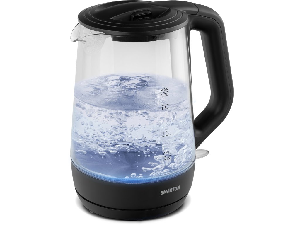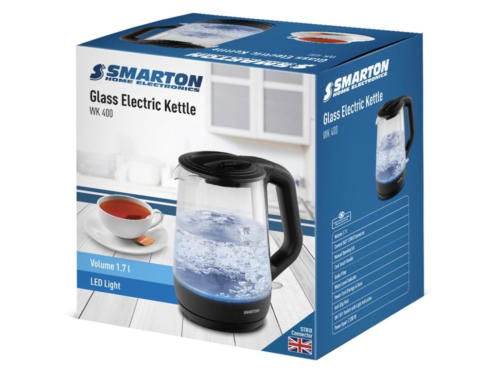 SMARTON WK 400 je rychlovarná skleněná konvice, která svým vzhledem zapadne do každé kuchyně. S objemem 1,7 je vhodná i pro početnější rodinu a s vysokým příkonem 2200 W pracuje pohotově, a především úsporně. Nabízí i příjemnou obsluhu, kterou zajišťuje ergonomická rukojeť a 360° STRIX konektor pro snadné umístění. Během vaření je navíc konvice podsvícená modrým světlem čímž snadno poznáte, že je v provozu.