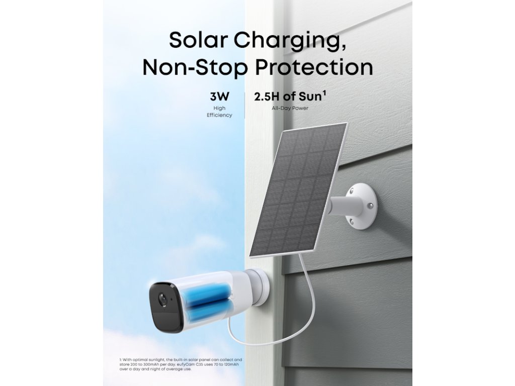 Tento solární panel je určen pro mobilní napájení domácí bezpečnostní kamery značky eufy (řada kompatibilní s kamerami eufyCam a SoloCam). Zajišťuje kontinuální nabíjení pomocí sluneční energie, čímž eliminuje potřebu pravidelného ručního dobíjení nebo výměny baterie.