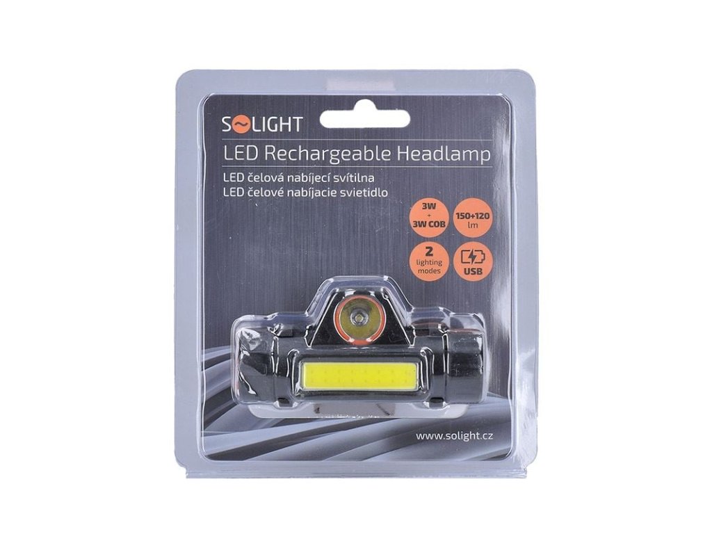 Solight LED čelová nabíjecí svítilna, 3W + COB,150 + 120lm, Li-ion, USB