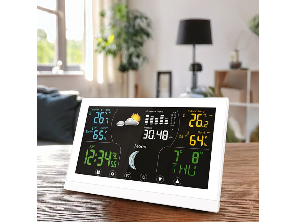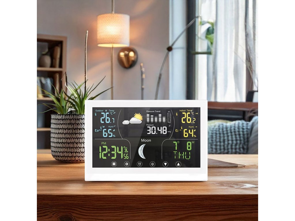Tato meteostanice nabízí barevný VA displej s dotykovým ovládáním o velikosti 168 × 93 mm, který zajišťuje vynikající čitelnost a intuitivní ovládání. Díky možnosti trvalého podsvícení je zobrazení přehledné i ve tmě. Displej poskytuje širokou škálu informací, včetně aktuální teploty (vnitřní od -10 °C do +50 °C, venkovní od -50 °C do +70 °C), relativní vlhkosti (1 % až 99 % RH), atmosférického tlaku a předpovědi počasí. Kromě toho zobrazuje fáze Měsíce, kalendář, datum a hodiny řízené DCF signálem, což zajišťuje vždy přesný čas. Stanice umožňuje záznam minimálních a maximálních hodnot, nastavení teplotní výstrahy, výběr jednotek teploty (°C/°F) a dokonce korekci nadmořské výšky pro přesnější měření tlaku. Je vybavena funkcí budíku s možností opakovaného buzení, což z ní činí praktického pomocníka nejen pro sledování počasí, ale i pro každodenní použití. Bezdrátové čidlo s dosahem až 100 m (součástí balení) umožňuje přesné měření venkovních podmínek a je možné připojit až tři čidla současně. Napájení hlavní jednotky je možné buď adaptérem (5 V DC/300 mA), nebo třemi AAA bateriemi, zatímco čidlo využívá dvě AAA baterie. Díky kompaktním rozměrům hlavní jednotky (17 × 192 × 127 mm) a elegantnímu černému provedení se hodí do jakéhokoli interiéru a poskytuje moderní a stylový doplněk domácnosti.