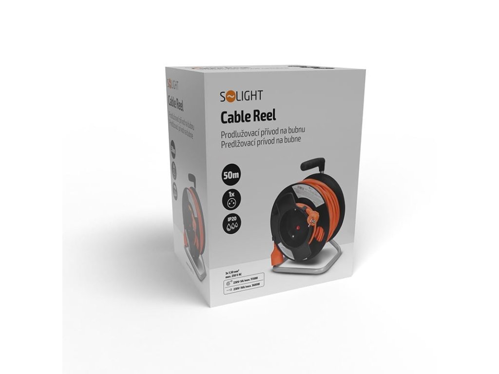 Solight prodlužovací přívod na bubnu, 1 zásuvka, 50m, oranžový kabel, 3x 1,5mm2