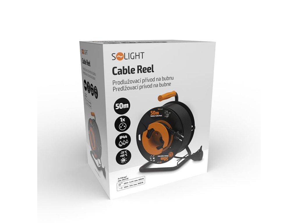 Solight prodlužovací přívod na bubnu, 1 zásuvka, venkovní, 50m gumový kabel, 3x 1,5mm2, IP44