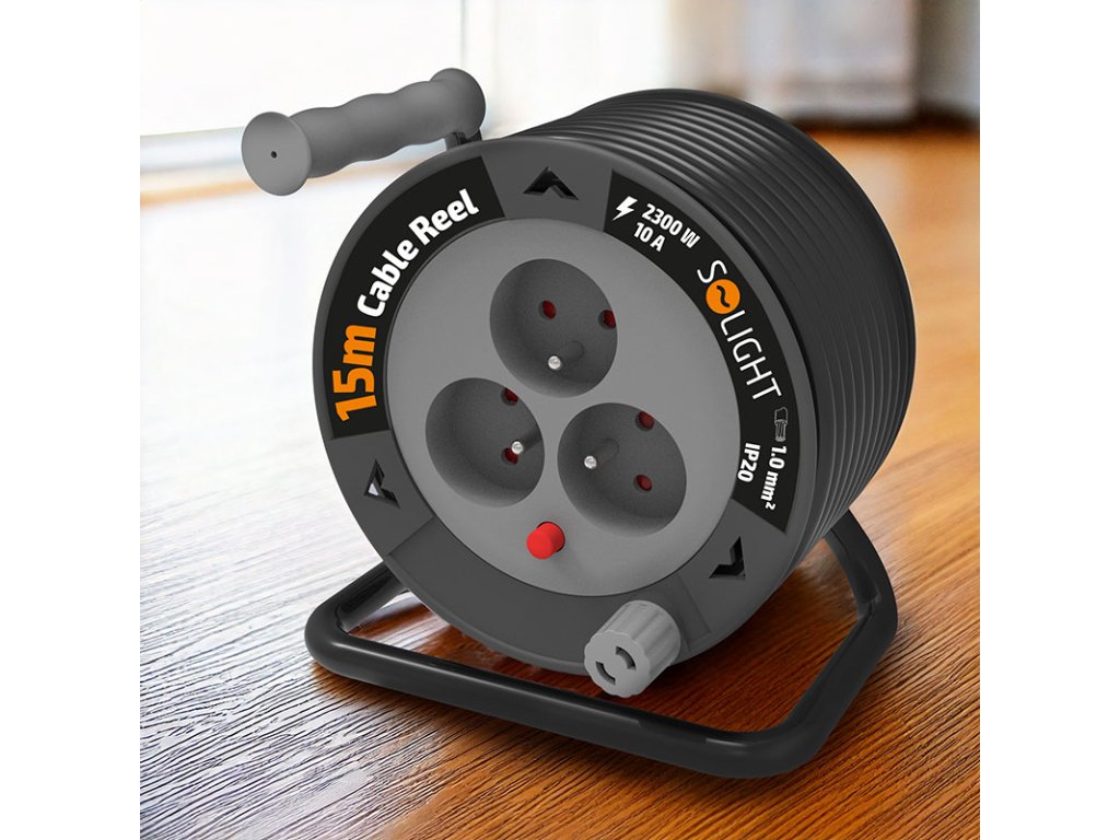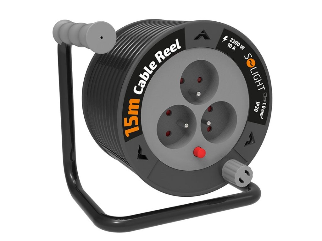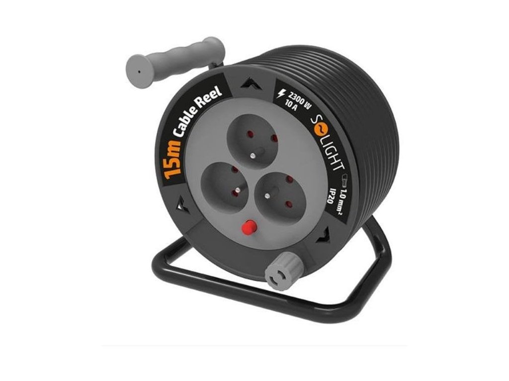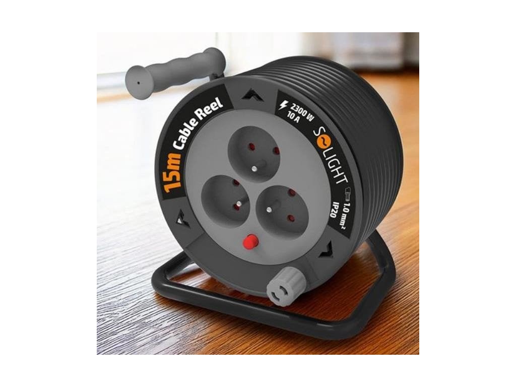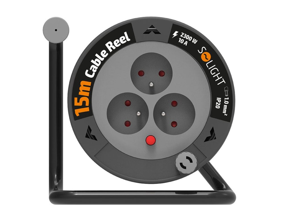 Solight prodlužovací přívod na bubnu 15m, 3 zásuvky, černý kabel, 3x 1,0mm2