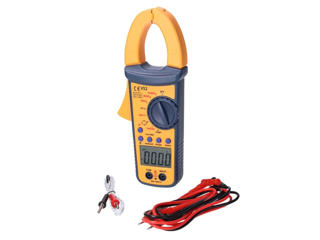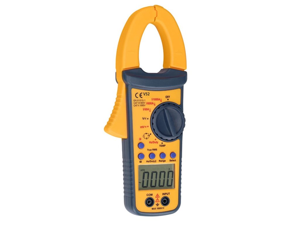 Digitální multimetr s max. zobrazením 6000 hodnot a podsvíceným LCD displejem (34 × 48 mm). Nabízí automatický nebo manuální výběr rozsahu a automatické vypnutí po 15 minutách nečinnosti. Měří DC napětí (0,1 mV – 1000 V), AC napětí (0,1 mV – 750 V, True-RMS), AC proud (10 mA – 1000 A, True-RMS), odpor (0,1 ? – 60 M?), kapacitu (6 nF – 60 mF) a teplotu (-40 °C – 1370 °C). Funkce data hold, indikace maximálních a minimálních hodnot, frekvence (0 Hz – 10 MHz) a střída (0,01% – 99,9%). Diodový test, kontinuita s bzučákem, a klemové měření frekvence. Napájení: 3x AAA 1.5V baterie. Rozměry: 240 × 95 × 40 mm, hmotnost: 342 g.