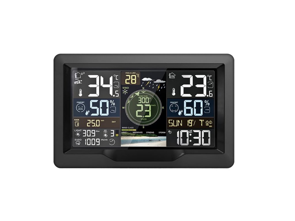 Tato profesionální meteostanice je špičkovým nástrojem pro detailní sledování meteorologických podmínek s možností připojení k aplikaci Smart Life / Tuya Smart, která umožňuje zobrazit aktuální naměřené hodnoty a převádět je do přehledných grafů. Nabízí automatické nastavení času přes internet, kalendář až do roku 2099 a dva budíky s funkcí odloženého buzení. Díky vysoce přesným senzorům měří vnitřní (-20 °C až 50 °C) a venkovní teplotu (-40 °C až 70 °C), vlhkost (20 % až 95 %), atmosférický tlak (600–1100 hPa), srážky (0–9999 mm) a vítr (rychlost do 180 km/h, směr 0–359°). Zobrazuje 12 úrovní Beaufortovy stupnice, měří intenzitu světla (0–128 klux) a UV index (0–15) s indikací sluneční expozice. Disponuje 4 úrovněmi podsvícení displeje, který zajišťuje skvělou čitelnost za všech podmínek. Bezdrátový venkovní senzor s frekvencí 433,92 MHz má dosah až 100 m v otevřeném prostoru a umožňuje připojení až 3 senzorů pro vlhkost a teplotu. Napájení stanice zajišťuje DC 5V / 1A adaptér nebo 2× AA baterie, senzor využívá 3× AA baterie. Díky moderním technologiím, přesným měřením a propojení s aplikací je ideální volbou pro náročné uživatele, kteří vyžadují profesionální meteorologická data v reálném čase.