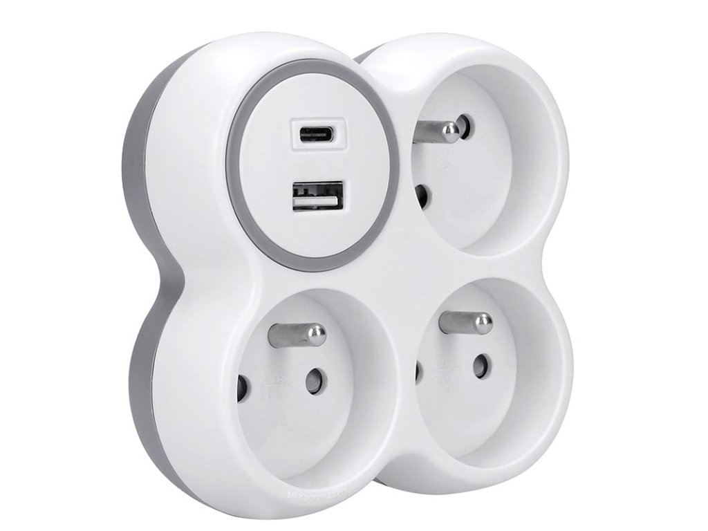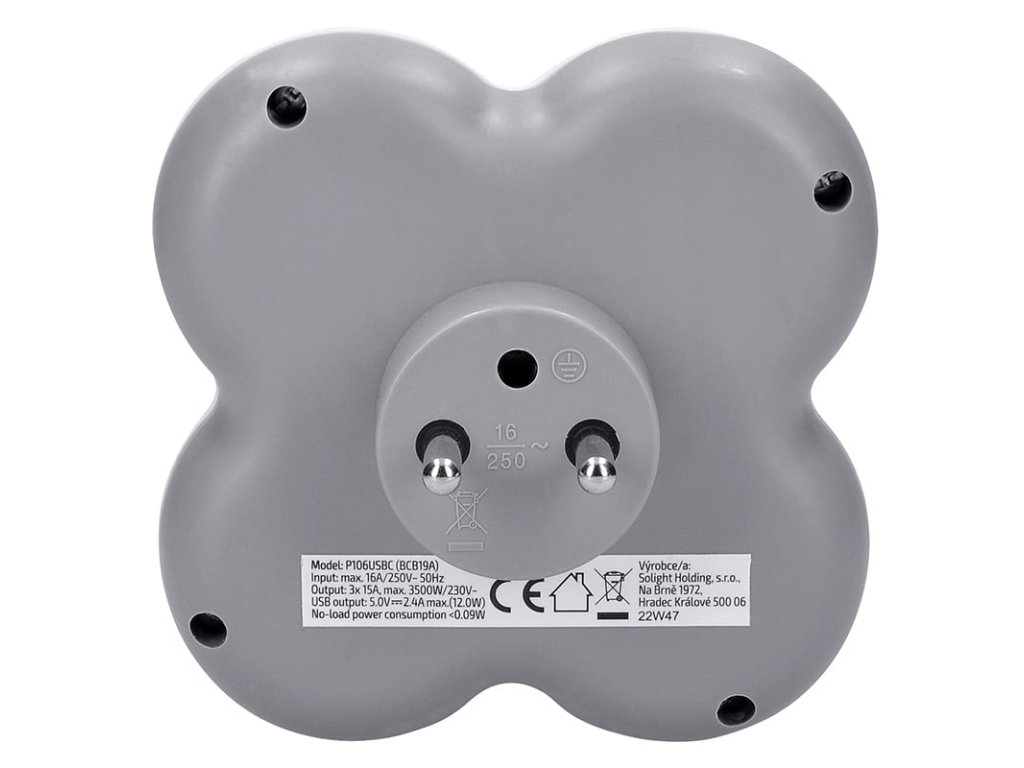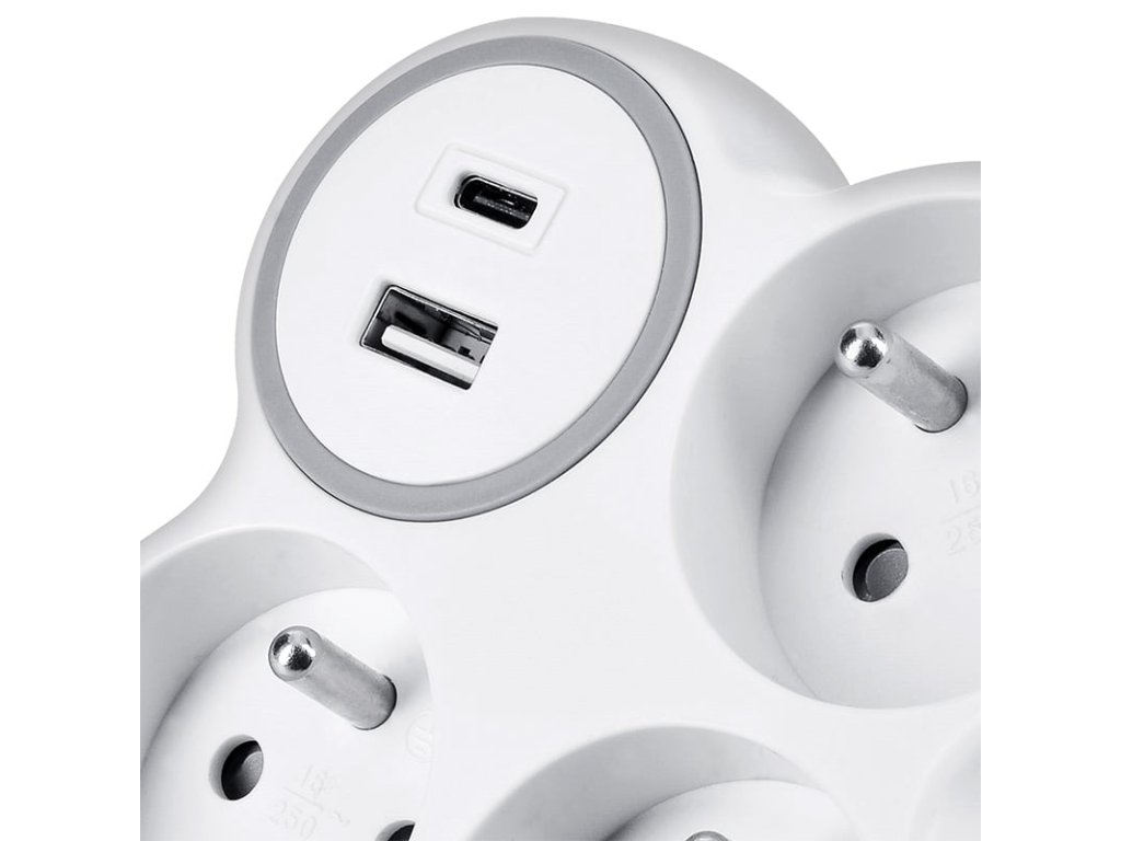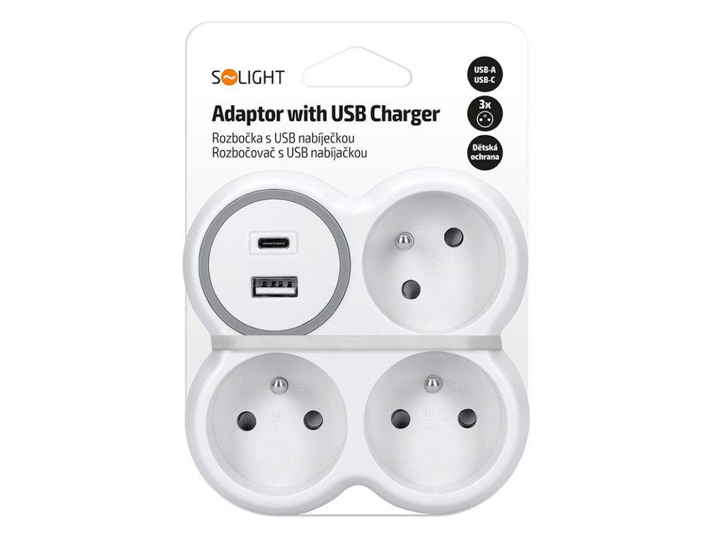 Solight rozbočka, 3x 16A, USB nabíječka A+C, bílá-šedá