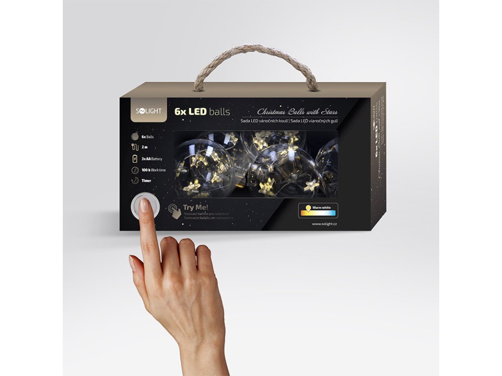 Solight sada LED vánočních koulí s hvězdami, vel. 8cm, 6ks, 30LED,časovač, tester, 3xAA