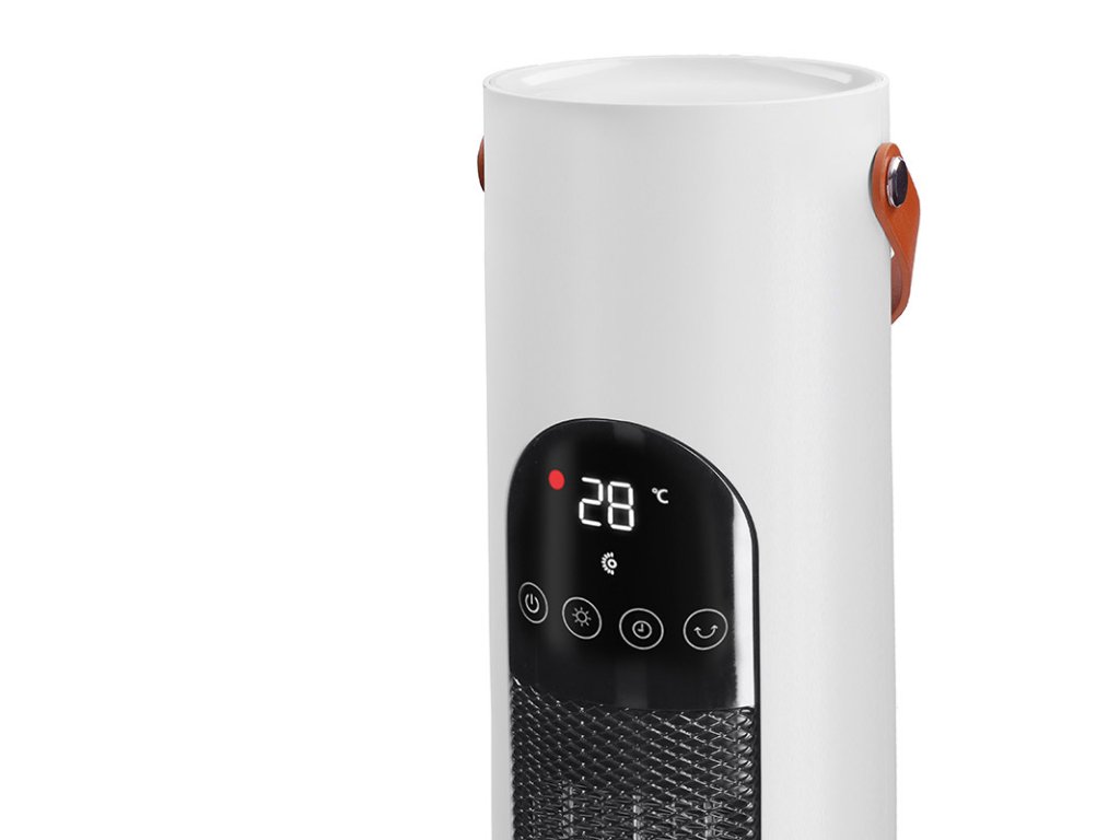 Keramický ohřívač 2000W s automatickým otáčením a třemi režimy provozu (ventilátor, nízký ohřev, vysoký ohřev). Nastavitelný termostat (18, 21, 24, 27°C) a až 12h časovač umožňují pohodlné ovládání. Digitální LED displej s ukazatelem teploty. Dálkový ovladač pro snadné nastavení. Ochrana proti přehřátí a převrhnutí zajišťuje bezpečný provoz. Lehký a snadno přenosný (1,9 kg). Napájení 230V/50Hz, rozměry 62 × 23 cm, délka kabelu 1,5 m.