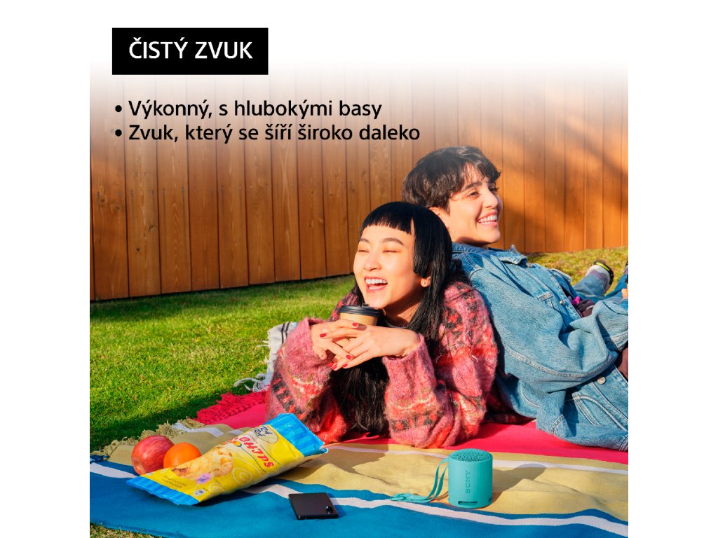 Lehký a kompaktní Sony Bluetooth bezdrátový reproduktor z recyklovaných plastů. Barva modrá. Bohatý zvuk z malého těla. Snadno přenosný a odolný reproduktor (IP67).