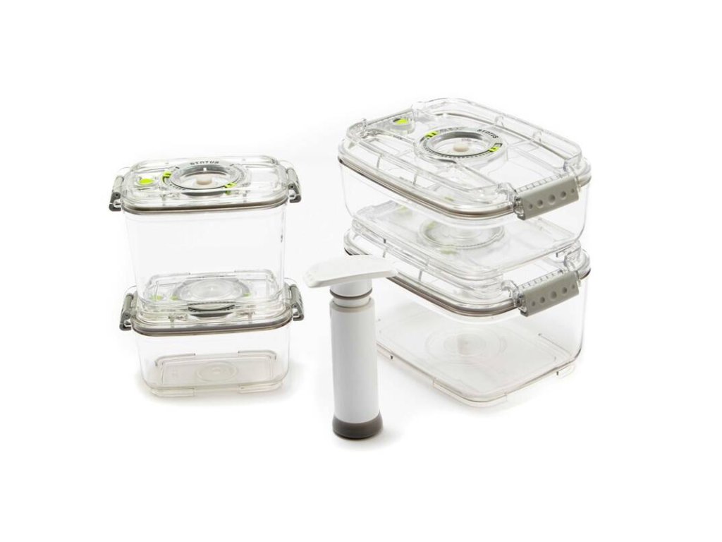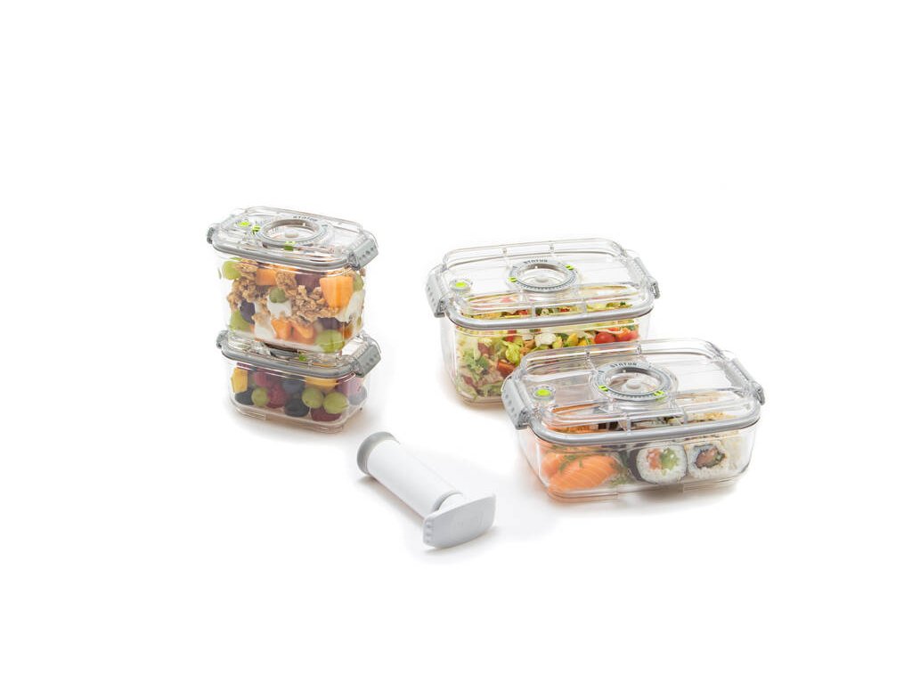 sada vakuových dóz • vhodné do mikrovlnné trouby, lednice, mrazicího boxu a myčky • ruční vakuovací pumpa pro odsávání • 4 dózy (objem 0,5, 0,8, 1,4 a 2 l)
