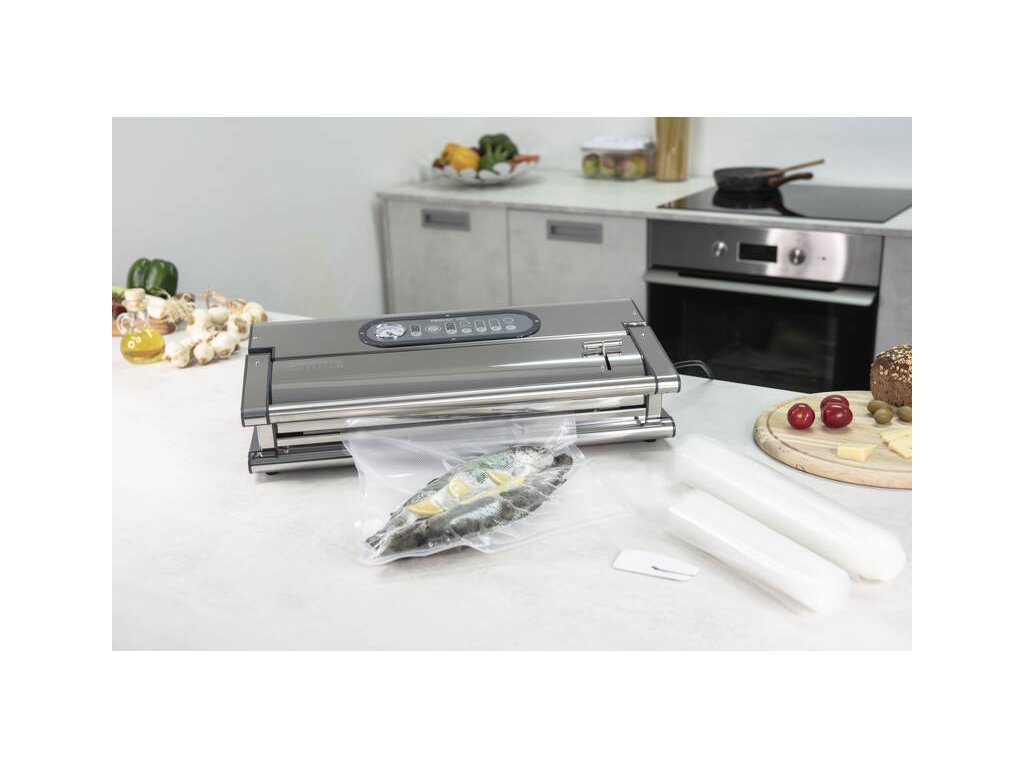 Nabízí automatický, manuální, svářecí režim a funkci marinování na 18 minut. Dvojitý svářecí proužek je zárukou perfektního uzavření sáčku. Navíc aktivní kontrola teploty reguluje proces svářování. Pro ochranu přístroje je vybaven senzorem a lapačem tekutin. Kontrolka Liquid Trap vás upozorní na vniknutí tekutiny a lapač zabrání vniknutí do motoru. Automatické otevírání a zavírání víka páčkou na víku a oboustranná lepicí páska pro upevnění sáčků do přístroje usnadní používání.
