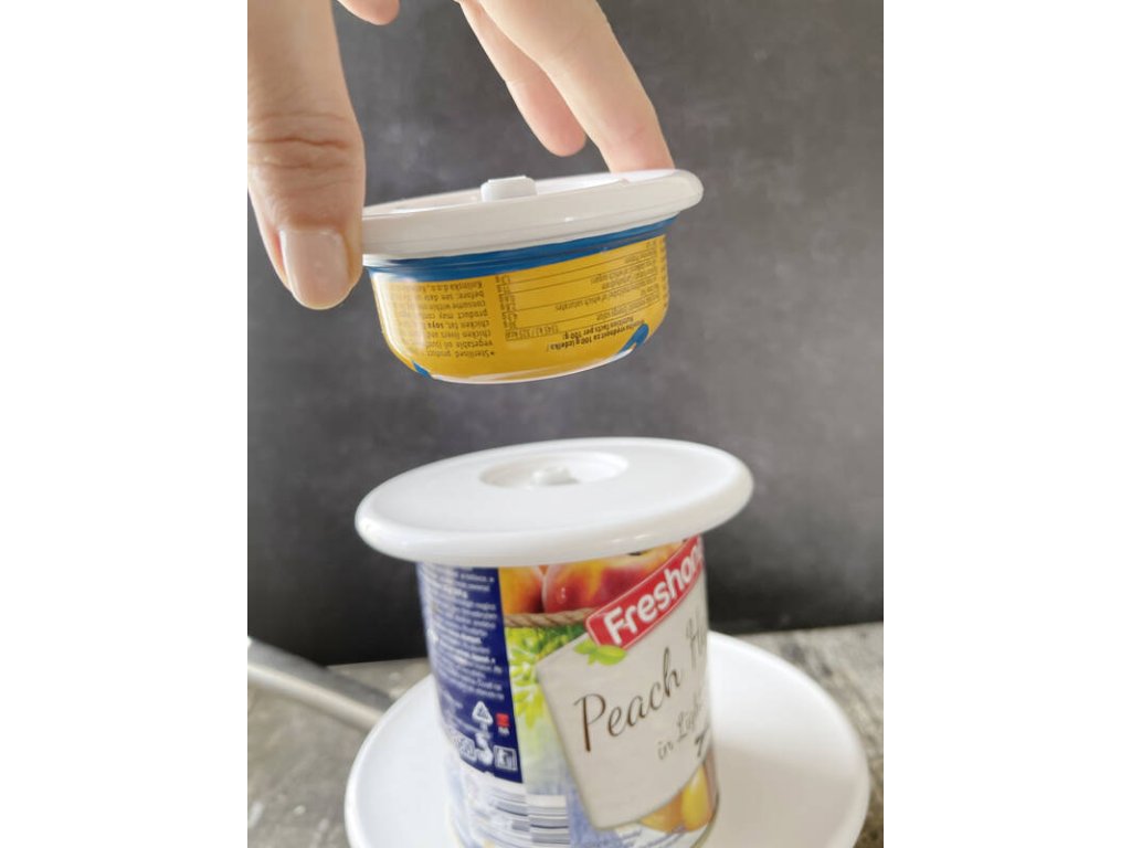 Univerzální vakuové víčko slouží k zavakuování v nádobě s rovným povrchem s průměrem od 6 do 12 cm. Průměr samotného víčka je pak 13,5 cm. Použijete jej pro nepřeberné množství tuhých i tekutých potravin, které jsou citlivé na vzduch. Uchování ve vakuu zachová živiny, zpomalí růst bakterií a brání předčasné oxidaci. Takto uložené potraviny zůstanou až čtyřikrát déle čerstvé. Použití je velmi snadné. Po naplnění nádoby a nasazení víka přiložíte vakuovou pumpu, kterou odsajete vzduch (vakuová pumpa není součástí).