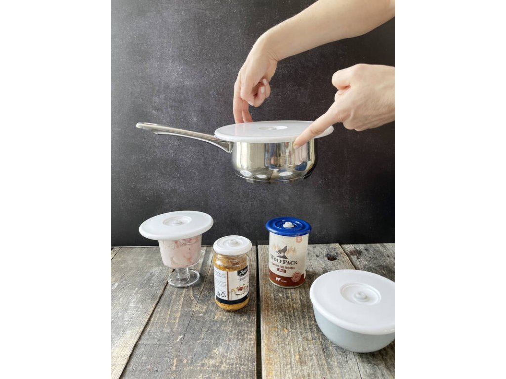 vakuovací víčko • víko z ABS plastu • těsnění a ventil ze silikonu • bez BPA • pro nádoby s rovným povrchem od 6 do 12 cm • průměr víka: 13,5 cm • vakuová pumpa není součástí balení