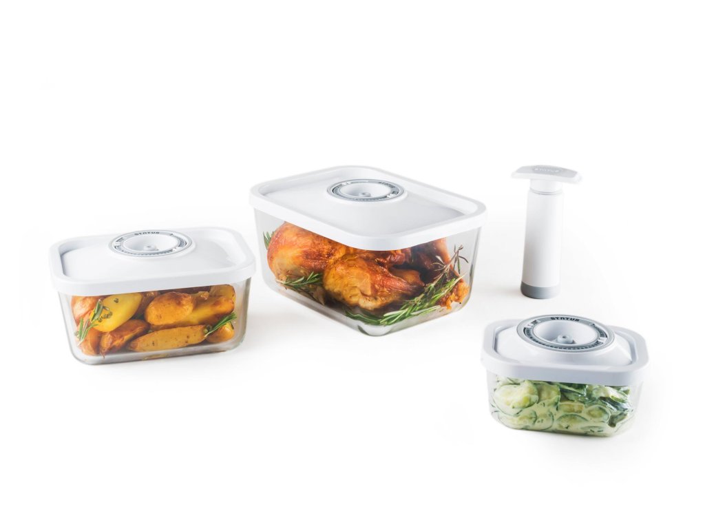 Hledáte multifunkční řešení pro skladování potravin a plastové dózy už vás nebaví? Vakuovací dóza o objemu 1,5 l od STATUS, vyrobená z kvalitního přírodního borosilikátového skla, vám nabízí mnohostranné využití. Tato průhledná a odolná dóza není jen ideální pro uchování potravin ve vakuu, ale také pro jejich přípravu a konzumaci. S touto dózou můžete pohodlně připravit a skladovat oblíbené pokrmy, jako jsou lasagne nebo gratinované brambory, a díky vakuování si udrží svou čerstvost, chuť a výživovou hodnotu až 4× déle. Skvěle poslouží i jako obědové boxy nebo při krabičkové dietě.