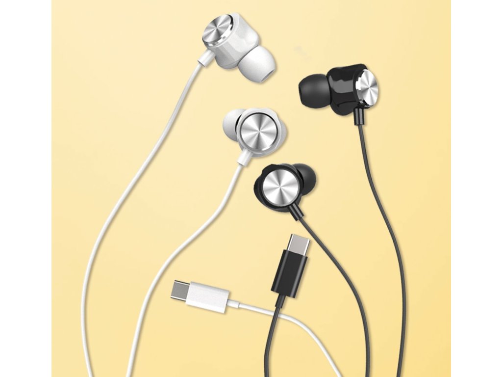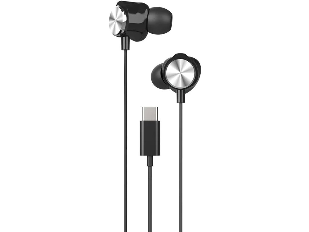 Špuntová sluchátka s mikrofonem, 10mm měniči, USB-C připojením, ovládáním na kabelu, frekvence 20–20?000 Hz, černá.