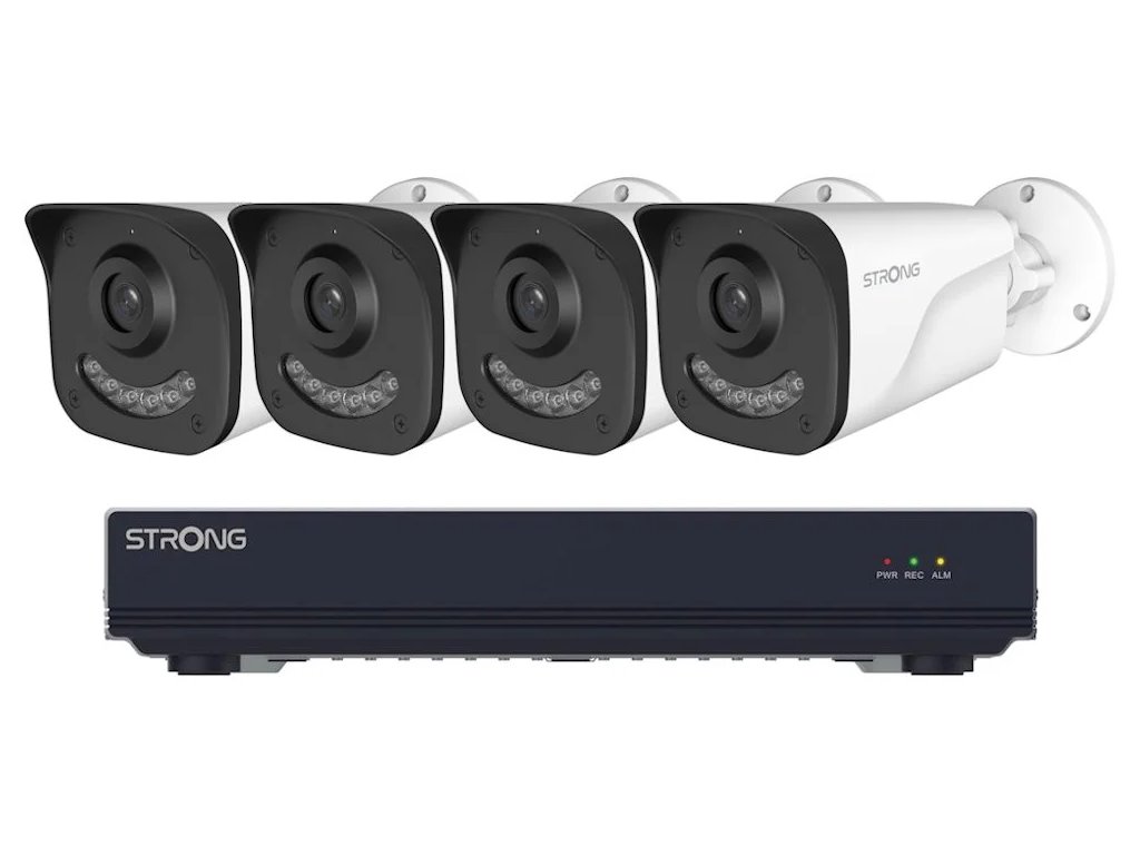 Sestava záznamového zařízení Strong NVR1120-8P a čtyř 5Mpx kamer Strong BUL05DL0-P.