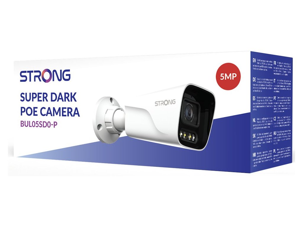 5megapixelová IP kamera typu bullet nabízí snímač CMOS, rozlišení 2880 × 1620 obrazových bodů a úhel záběru diagonálně 112°. Video ve vysoké kvalitě zaručí také při nočních záběrech díky LED přísvitu do vzdálenosti 15 m. Připojení lze jednoduše realizovat pomocí RJ-45 portu. Díky aplikaci Vision by STRONG lze sledovat dění 24 hodin denně 7 dní v týdnu odkudkoli skrze váš smartphone. Kamera je navíc odolná vůči nepříznivým vlivům počasí dle certifikace IP67.