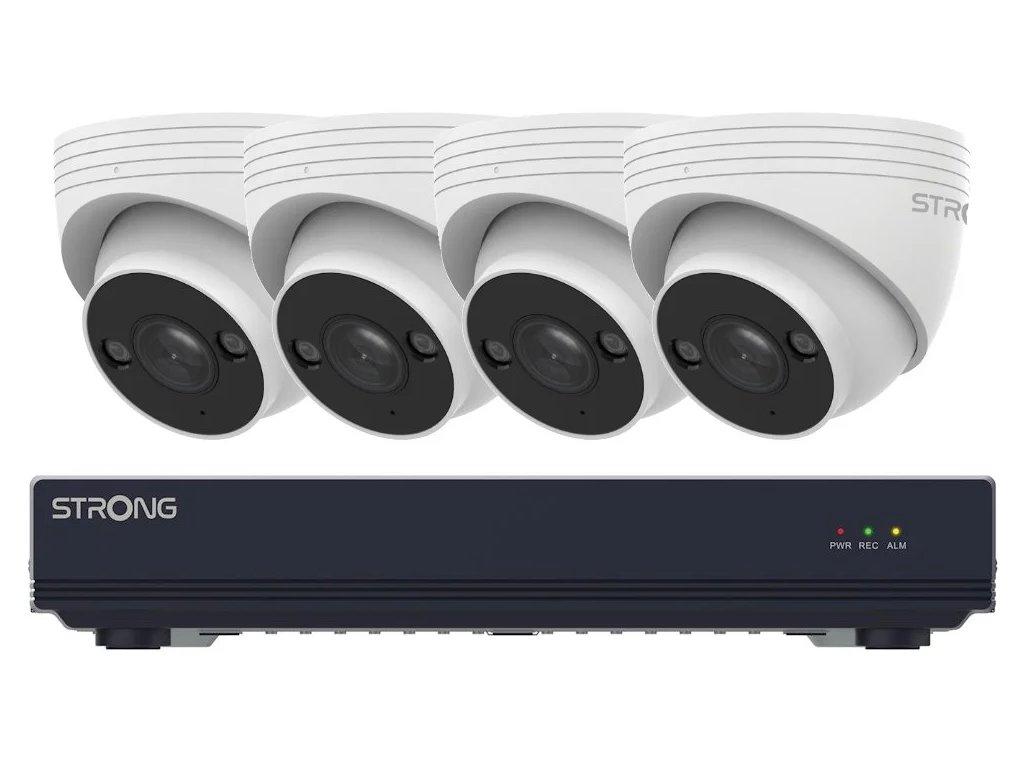 Sestava záznamového zařízení Strong NVR1120-8P a čtyř 5Mpx kamer Strong TUR05DL0-P.
