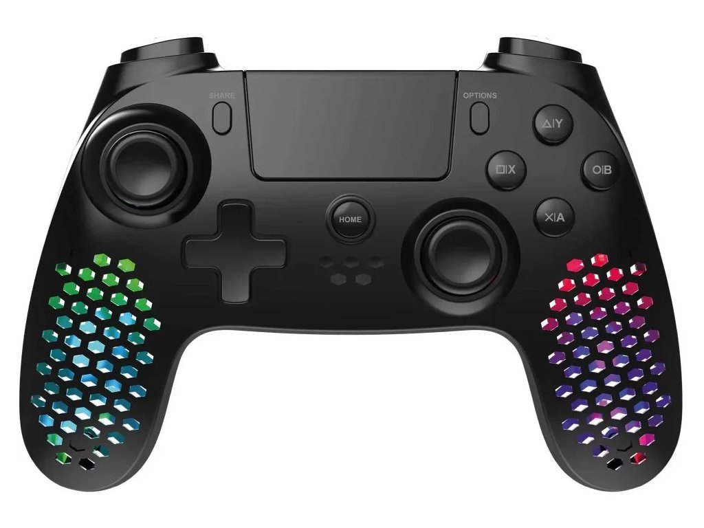 Lehký bezdrátový gamepad založený na technologii Bluetooth podporuje připojení k počítači nebo herní konzoli PS4 a PS3. Díky vibracím nabízí realistický zážitek ze hry. Disponuje přizpůsobitelným joystickem, směrovým D-padem s různými tvary a 17 tlačítky, se kterými budete mít všechny herní funkce vždy na dosah ruky. Jedinečný perforovaný design ovladače skvěle doplňuje nastavitelné RGB podsvícení. K dispozici je navíc také 3,5 mm jack konektor pro připojení sluchátek. Napájení zajišťuje integrovaná baterie, její dobíjení pak přiložený nabíjecí kabel.